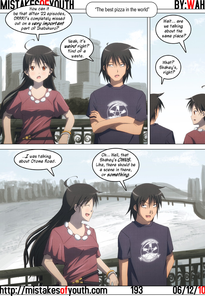 Yeah, I don't expect anyone to get this comic, and even if you do, it's not terribly funny. I was stuck between Rets mentioning all of the porno movie theaters in Ikebukuro and him mentioning the Shakey's there. As you can see, I chose Shakey's because it, well, owns. I guess this comic doesn't actually say anything about Durarara!!, which is an issue I've been struggling with. It's kind of difficult to turn your opinions on a show into a comic, so instead I of doing that, do dumb things like this. I thought the art in this was going to turn out better, but in the end it's rather crappy. I do like the folds on Tina's shirt, though! But yeah, that's it. I'm probably going to go through all of the summer anime offerings, pick out the ones I want, and write a post about it. So look out for that... in a few hours I guess? Later! |