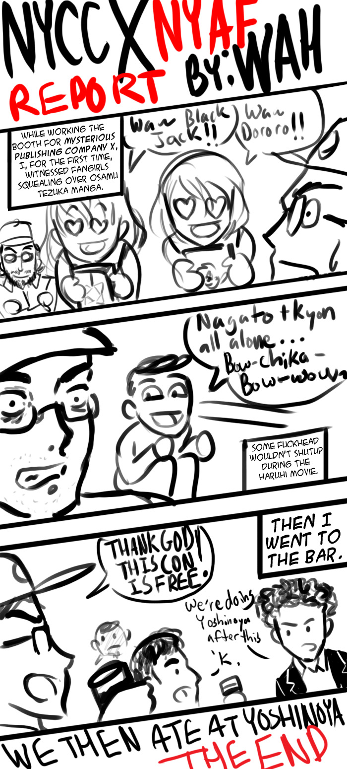 Alright, this was meant to go up on Sunday, but after buying a Nintendo DS along with a copy of Pokemon Soul Silver, other things I wanted to do were just not happening. But now the shiny glow of my new game has worn off, and I will no longer be playing it for three hours on end, so here is your NYAF/NYCC report. And that's all there's really going to be, since I didn't do much. Hell, the con was so uneventful, I gave up podcasting with Sub after about 10 minutes of, "man, NYCC sure destroyed NYAF." The one good part of the con was seeing the Haruhi movie, and I will probably try to write that up sooner rather than later--sooner being relative, that is. Expect another rough comic like this up later this week. The news story it's commenting on will already be old news when it goes up, but it needs to go up. Hopefully I'll have a comic up for next weekend, but I can't be sure. It isn't drawn yet, but I'm going to try sketching it straight to the computer just to see if that makes things a bit faster. It's getting closer to the point where I'd rather go all digital than waste money on pencil lead and sketch books that take up space. Anyway, back to Pokemon. |