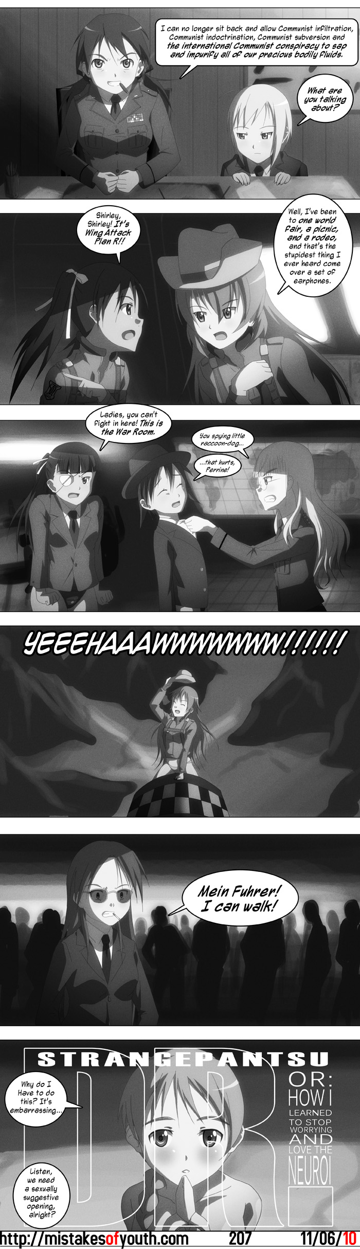 News of the Strike Witches movie prompted this comic. It got me thinking of what kind of Strike Witches movie I'd really like to see (as opposed to what will actually get made, which will probably own anyways) and my mind immediately went to Dr. Strangelove. At first I was going to do a parody suggesting that the Strike Witches movie was going to be a Cold War thriller with strong allusions to Dr. Strangelove. Considering Strike Witches takes place in WWII, and Dr. Strangelove presumably takes place in the 1960s, I'd have to age all the girls by 20 years. But since I didn't want to draw a 35 year old Miyafuji Yoshika, I instead opted to do the Strike Witches girls acting out scenes from Dr. Strangelove, more or less verbatim. Is it funny? Uh, I dunno, maybe. But I really like Dr. Strangelove, and I really like Strike Witches, so here you go! When coming up with what character portrays who, I either tried to match them up according to personality, or find the polar opposite. I also took the various girls' relationships with each other into consideration. While Miyafuji is nothing at all like the Russian prime minister, Perrine's rivalry with Miyafuji is good setup for the fight between Turgidson and the prime minister. Gertrude isn't that crazy, but she's crazy enough to be Jack D. Ripper, I think. Lynette would probably have been more accurate choice for Mandrake considering her nationality, but Erica's dynamic with Gertrude works better. Shirely as Commander Kong works, and Minna as Dr. Strangelove is pretty funny, I think. I was just going to use a screencap from the opening of the movie for the last panel, but I figured I needed Lynette in there some place, so I threw her at the last minute with a banana between her boobs. While it's far from perfect, I'm pretty happy with the art here. Sketching on the tablet is getting a bit easier, so I think I'll just continue to do comics completely digitally from now on. It'll save money on sketch pads and pencil lead, at any rate. Later! |