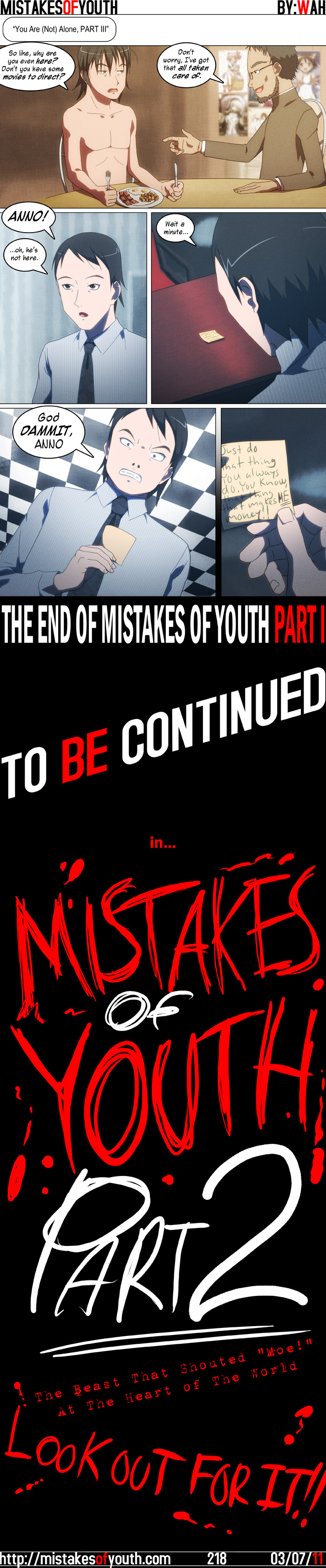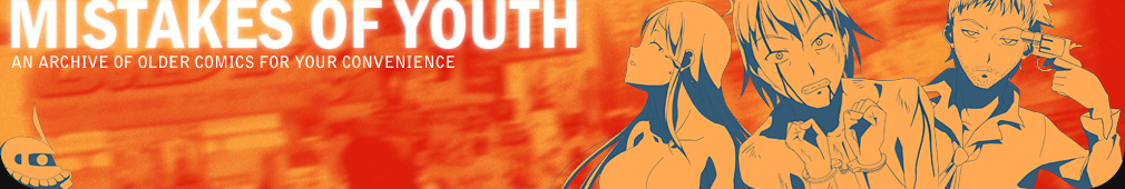 At long last, the end of Mistakes of Youth... part 1. The reason why I'm arbitrarily drawing a line here is because I'm going to be changing the entire Mistakes of Youth site over to WordPress soon. This will happen once I finish the next comic, which may not be for a while since I'll be changing residences again pretty soon. But look out for it! All the comics up until now will be moved to a different location, probably http://old.mistakesofyouth.com.