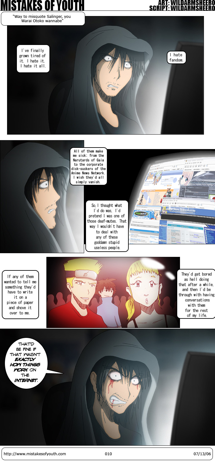 ---------------------------------- Rets is known for highly opinionated evaluations of American anime fandom, but him quoting classic American literature is a bit of a rarity. No, I haven't actually read The Catcher in The Rye but I am familiar with the quote through the Ghost in the Shell TV series. It's sad, I know. I can't say for certain that Gaia is filled with Narutards, as I don't post there. Let's just call it an educated guess. I can say for certain that the Anime News Network forums are filled with sheep that stroke and lick the phalluses of companies such as ADV and the like. It's not that I don't want to give decent companies my business, but I also don't think that downloading a show as it airs in Japan is a crime punishable by hanging. As far as art goes, this comic is a lot better than last week's installment. The difference could be that I actually felt inspired this time, rather than just drawing something to kill the passing hours. I did recycle backgrounds, but recreating Rets' room comic after comic is rather tedious, and would also suggest that his room is constantly changing. I'd like to create some concrete locations here! In other comic related news, we finally got our location for the Artists' Alley at Otakon. It is indicated in the graphic below. ![]() What a lovely location! We're grouped with a ton of other webcomics, I'm not sure how well that'll go. I'd like to echo Shingo a little here; NHK ni Youkoso! is most definitely an adequate successor to the Haruhi timeslot. Like many others, the main thing I was worried about right off the bat was "the Gonzo factor." We all know about Gonzo and their reputation, so anyone would be worried, right? Well, I am happy to report that they have not "fucked it up", at least not with the opening number. The show begins with a wonderfully animated opening sequence, which probably rivals that of Cowboy Bebop, in my opinion. While people have shunned it, saying it doesn't fit NHK, I'd like to challenge that. The NHK opening has a very magical and almost surreal air to it, partly created by the ROUND TABLE Feat. Nino song, "Puzzle" (which is the new Featured Song, by the way) and by the unique look of the animation. In a way, it represents escape from society. All of the people shown (save Satou and Misaki) are faceless, which suggests society's cold rejection towards these characters. All the scenes with Satou have him in his room (with his head exploding, at one point) while one scene with Misaki has her in a rather magical looking place, done up like an angel. Satou's escape is his room, while Misaki's escape is her act as Satou's saviour. Ugh, this made a whole lot more sense last night. What I'm trying to say is that it fits, dammit! And even if it doesn't, it's still directed brilliantlly. Especially the last part. I swear, Japan is the only country that can make a boob-jiggle artistic. This first episode pretty much followed the manga, save the inclusion of a new opening scene (which is apparently inspired by an old Shounen Ace omake) and the shuffling of some events (they seem to be saving Yamazaki's introduction for episode 2.) Animation wise, NHK is fairly decent. While it's certainly not as fluid as Yuuutsu, it has specific look that works real well. The music is above average, and is integrated well into each scene. In fact, the entire audio mix for the first episode was incredibly well done, from Yamazaki's Pururin theme intruding into Satou's room to the sounds of Satou's hallucinations. NHK is already my favorite of the season; let's hope it stays that way. Did I mention that the ending sequence is fucking nuts? In order to kill some time yesterday, I made an NHK wallpaper in honour of the first episode. Slightly NSFW. Chocotto Sister is pretty much the lolikon fun-fest I thought it would be. If there is any hook, it's this. I rather enjoyed the first episode, especially considering I have about 6 Japanese lessons under my belt (there is no subtitled version available right now). The animation is below average, which was painfully apparent from the opening sequence, but I am able to forgive that given I like everything else about the show. The only instance where the show has high quality animation is in the ending sequence, which contains a dance. Yes, a dance. I am getting Haruhi vibes here, but I heard that this dance is a nod to the original comic, and not an attempt to capitalize on Haruhi's popularity. Riiiiight. As much as I'm loving the new season of Hachikuro, I can't help but feel I'm being spoon-fed by this new director. Here's an example: at one point in episode 2, Yamada asks Shuuji what she should talk about with Rika. Shuuji goes on for a bit on how Rika doesn't talk much with people that she likes. A little bit after that, let's say 30 seconds later, Yamada is walking back home. The director then cuts to a scene where Miyama tells Yamada that he doesn't talk about much of anything with Rika. Ok, this would usually be fine, but the problem is that this scene happened about 10 minutes ago in the same episode. Mr. Director, I'm sure I can remember what happened some 10 minutes ago and make a connection between that and what Shuuji said. I actually did, right when he said it. What I'm saying is, this director isn't subtle enough. I'm not sure if the original Honey and Clover series did this (I haven't seen it in quite a while) but I'm not sure if I like this spoon-feeding. The director also flashed back to parts of the original series, too. Gah, I'm getting Gundam Seed Destiny flashbacks. Zac Bertschy is an asshole. That's really all I have to say. Before I close this rant, I'd like to post the calendar pics for July and August. |