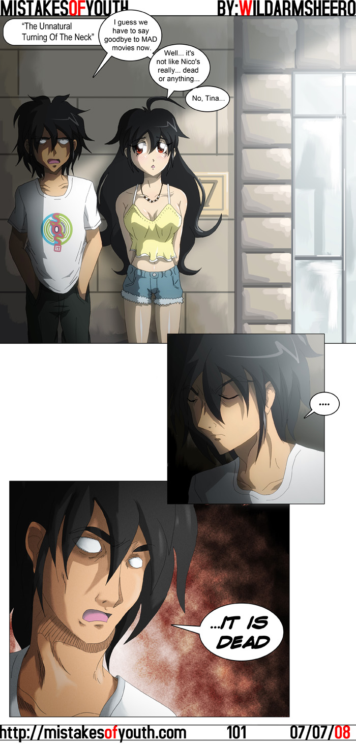 Before anyone says anything, yes, his neck is supposed be messed up like that. It makes that last panel all the more frightening. Maybe I should have added some CRACK CRACK sound effects. Wanted to get this one out quick while the news was still kind of fresh. It's already pretty old now, but better to post it now than this Saturday! This comic may be overreacting, though, because I just went on Nico and it seems people are still uploading MADs despite this BS. I wonder if that'll change in a week from now? My mylist has suffered only minor damage thus far, with the Akagi/Hidamari Sketch op crossover being the only loss. Good thing I saved that! This comic is ok. For some reason drawing people straight on is totally difficult, so I had to fix up a lot of things, mostly Tina. And even after fixing up Tina a lot, I still missed the giant mistake on her shirt. Oh well. She still looks kind of hot, right? Panel two is kind of messed up, as well. Way too angular and pointy. I do like that background, though. For those who can't tell, it's the side of a big-ish building. It's a great hangout for teenagers! That's all for today. Hopefully I'll have a comic up for next Saturday, but don't count on it.. |