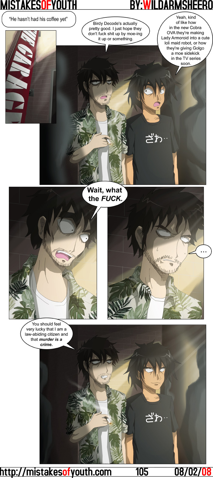 ...and with this strip, the entire comic takes place in Massachusetts. Well, I guess that was already the case when I made the characters hanging out at T Stations, but still. The location of the comic has always been a vague thing, but lately I've been opting to make the characters hang out in real locations... sometimes. I'm not in Boston right now, however, so I'm unable to snap locations and work off of them, but once I get back that'll probably be happening. It makes for more realistic backgrounds! Anyways, I think this comic turned out fine. Some of the facial expressions are wacky, but overall I think it's ok. The script is fine too, I guess. One complaint this comic often gets from the Peanut Gallery-- aside from the art being atrocious-- is that it's not funny. I'm inclined to agree; I'm not a good writer. I'm still trying my best to carve out jokes while staying true to my character's thinly defined traits, along with only making comics based around anime fandom. It's a hard thing to do, but I'm not going to use that as an excuse. Comics need to be funny, and if they're not they fail, full stop. If I had to look at my work completely objectively, I'd say that most of it would barely garner a modest chuckle. So, I'm asking you guys-- what do you find funny about anime and its fandom? What would you like to see lampooned? What kind of humour makes you go nuts? Or is the current style of the comic fine? Not sure how many of these responses I'll actually implement, but it'd be interesting to read them. So, leave a comment! Anyways, moving on to a less angsty subject (?)-- Otakon. It's in a week, and a few updates ago people said they wanted to meet up, so a meet up will happen. As of right now, I'm thinking 1:30pm on Friday would be good. IIRC it's 90 minutes after the Dealer's Room opens, and 30 minutes before the opening ceremonies, giving you time to shop, and time before the opening ceremonies if you wish to attend those (I kind of want to see the opening animation out of morbid curiosity.) That's the plan for now-- if any of the people meeting up have issues with that time, leave a message. The meeting place will be that coffee shop (I believe it's a Starbucks) near the registration booths and by one of the main entrances. I hope everyone knows where that is. I'll be wearing a hat. Saimoe has apparently started, but I think I'll watch it from the sidelines this year. It was fun to participate, but getting around Comcast blocks was a total pain. Once it gets to the point where I reside in Japan, I will participate no problem, but until then... I'll just catch the highlights. Also, Kaede probably isn't in the running, so what's the point? :V This anime season is really brutal. I've dropped Telepathy Shoujo Ran since I was three episodes behind, and it didn't seem all that hot anyway. If for some reason it gets crazy good praise then I'll get back on it, but for right now it's dead. I'm enjoying the rest of what I've ended up with, but I'm still always stuck in backlog. Like I keep saying each week... I'll try and finish that backlog off today. It's only about four episodes now...! And with that I'm off. Later. |