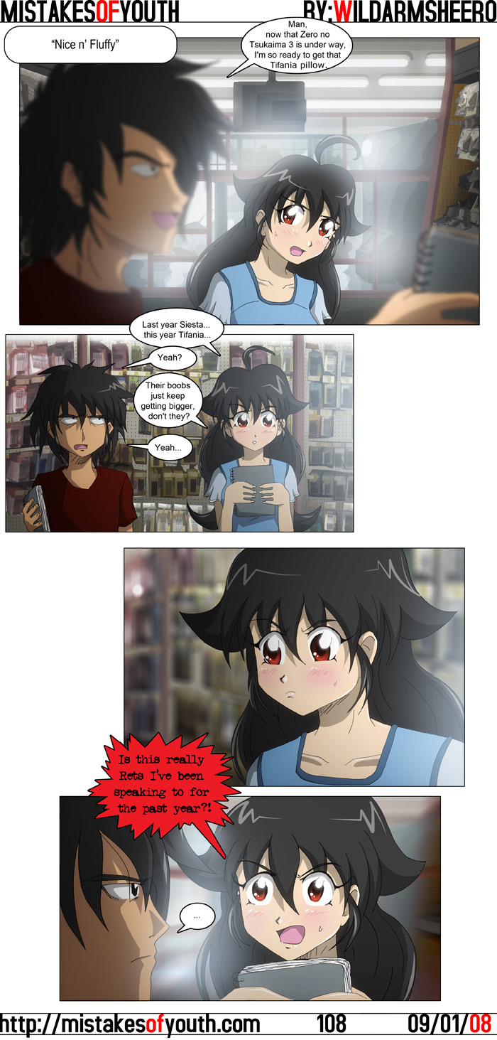 Character centric humour? Unbelievable! Though, I'm not sure if this one is really funny. I just wanted to write something about 0nT. I hope it's funny though, since the next comic is basically this joke again. This comic kind of feels like corny anime humour, so if you like that (as I sometimes do) I guess you'll like this. By the way, they're in Staples. It's time to buy school supplies. Time to finally address that question I asked to all of you about a month ago regarding what you want out of the comic. Like I said earlier, I won't 100% implement any of these suggestions, but I did read them all and took them into consideration. One big one was that the humour is too obscure. This is not something I will change, since this comic is built around obscure not-quite-PPD-level-but-more-Hayate-level anime jokes. One other suggestion was to flesh out the characters more, which I do kind of try at. I'm not a great writer, and I'm no master at defining character traits, but I do try my best to improve. I'll just say that yeah, I'm working on it, and hopefully... maybe these characters will be memorable and live on in your hearts forever! Yeah right. But I'm trying. And the last notable bit of advice was to just keep doing what I'm doing and improve, which is what I'm doing anyways. Or trying to. So, thanks for the comments. They were helpful. Anyways, on to other stuff. One show that's been surprisingly enjoyable has been World Destruction. Despite the dumbass premise, the show actually manages to be very entertaining. It's a popcorn-flick type of entertaining, but still entertaining nonetheless. All the characters are fun, and each episode is written decently enough. The best episode ever was probably when they pit Toru Furuya and Shuuichi Ikeda together as rival characters... and these characters were both cute little teddy bears. It's great. Nogizaka Haruka has kind of gone down a quarter of a notch from its opening episodes, but I still like it a lot. Haruka is consistently delightfully moe, and her younger sister Mika is the kind of mischievous loli I love. I hope another season is greenlit, since one cour isn't really enough. Code Geass is really bad. But it's gotten bad in the same way that I assume Kazuo "PEE IN MY EYES TO WASH OUT THE BLOOD" Koike manga is bad. It kind of lagged in the middle because the writers were taking their bullshit entirely too seriously, but now it's relaxed back into being wonderfully over-the-top and nonsensical. What's sad about the show at this point is that the damage done, and it's not Taniguchi's fault. I really wanted to see his original concept-- what he had in mind sounded like it could be s-CRY-ed-level good, as opposed to this season which is very School Days. Except not as cool. And that's all for this week. I have a day or so off before classes start, so in that time I'll try to crank out this other comic and get back on track. Later! |