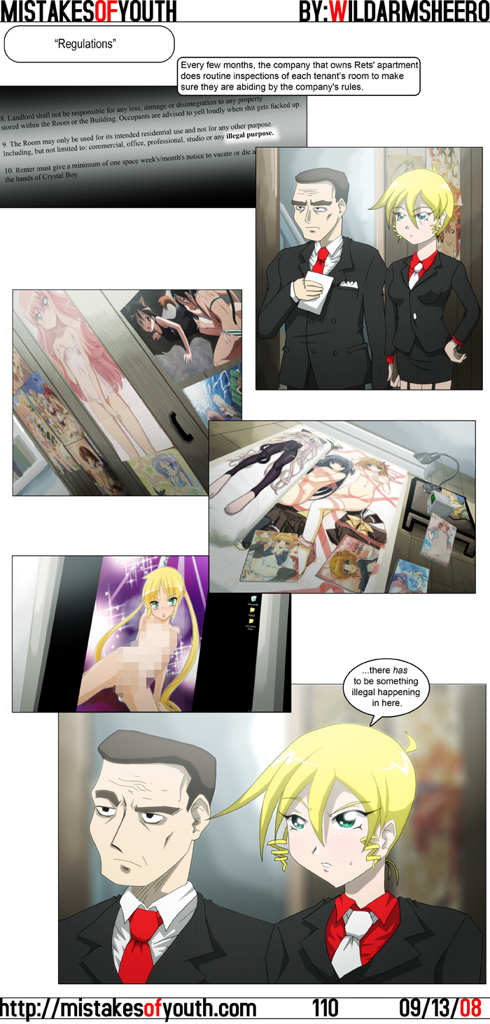 Yeah yeah, I'm wild, crazy, and free of all morals, but I like to keep the front page of this site fairly work-safe, so as such I've censored this comic. Do not fear, though, for an uncensored, and funnier version of the comic does exist. Inspiration for this one came from the room rules present in my new digs. I'm living in kind of a boarding house situation right now, so the rules are stricter than when I was living an apartment, but I can deal. Anyways, I found rule 9 to be funny, so I just drew a comic around it. Oh yeah, I guess I better credit some doujin artists here, considering I've stolen some imagery. The books in the panel four are the works of You Nagisawa, Koume Keito, Miki Miyashita and Atsushi Yamasomethingorother. The desktop image in panel five is by this awesome dude. I was planning on re-watching Nadesico at MIT since they were showing it, but when I went there today I saw they were playing the release with all the horrible overlays. It was fun to see the first four episodes again and pick up on some of the early clues and nods to future events, but I'm far too much of anal purist to watch something from ADV's darkages. I'll still pop in for Windy Tales, though. That show's pretty ok, but by the time they got to it I was nodding off. Zero no Tsukaima has hit a pretty good balance between plot, character stuff and fanservice. I'm actually getting into this little rescue plot they have going on now, and Louise's inner struggles are cute. Of course, I still watch it for the skin, and it looks like the next episode will deliver that well. You really gotta feel sorry for the guy in Detroit Metal City. His life is just fucking terrible, and I don't know if I should laugh at him or cry with him. That's not to say that the show isn't totally hilarious, because it is, it's just that poor Negeshi doesn't get a break! Also, I know it's terrible, but I have both the metal opening and the Flipper's Guitar-ish ending themes stuck in my head. AT THE SAME TIME, GOD. That's all for this week. It's pretty late, so I'm gonna plop myself in bed and try to sleep in. Try, since waking up at 6:30am all summer has ruined me forever. Now it's pretty much impossible for me to sleep past nine, but dammit I'll try! |