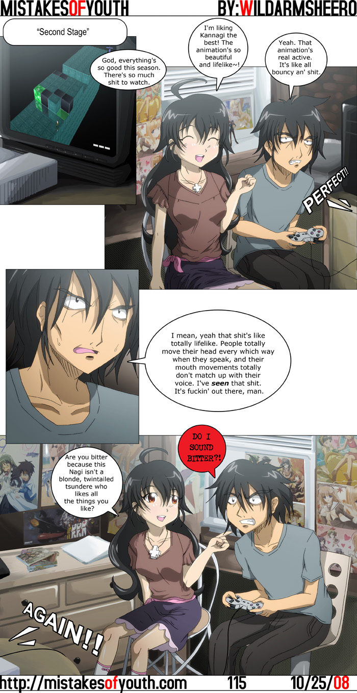 Personally, I have no problem with Kannagi's Nagi. She's not as good as The Real One, but is still decently cute. I retooled this script a lot until it got to the point where it sounded somewhat natural. One decision I've made with this comic recently is that I want the scripts to be a little slice-of-life-ish. Of course this is no excuse not to be funny, but instead of trying to make heavy hitting, Penny Arcade style things, I'm going to try for more subtle and... insightful things. Or just write potential excerpts of conversations that real anime fans would have. I don't know-- maybe that's not exciting, but I write what I know! Well, kind of. I don't know girls, so that's kind of lie when it comes to Tina. The artwork this time around is most certainly better than last week's abortion, but it's not great either. Rets' face in panel two is a bit too fucked up for even him. My favourite part of this comic is probably the first panel which features a screencap from the Most Awesome Game Ever. On that note, I have newfound respect for gaming comics. Drawing hands holding controllers is the most difficult thing in the world. Oh, and I guess another thing I should mention is that Tina's outfit is totally lifted from Nogizaka Haruka no Himitsu. I feel no shame! No shame! Lately I've been working on another comic project independent of this one. It's for a friend of mine's anime club, and I'm roughly half way through. For this I'm actually laying out panels on a page as opposed to arranging illustrations into panels on the computer like I do with this comic. It's different, but good. The comic is mostly good, and the only real horrible portion is one panel on page 5 which I will "fix in post" as they say in the movies. I don't really know the details for his anime club, because he hasn't really given them to me. Once he does I'll post them up here so, if you're in the area, you can stop by and buy this comic. If you want, of course. It should be really cheap. Three bucks or something. One last site related thing I should mention is this Fakku (18+) plug. Thanks Jacob! I got almost 10 times my normal amount of visits when this link first went up. I know not everyone will stick around, but out of 17,000 visits, I'm sure at least some of them will stay! It's weird though. I believe Fakku linked me once in the past, but that time I didn't get nearly this amount of traffic. Maybe their userbase significantly expanded or something. I've been watching Windy Tales at MIT over the past month or so. A first I didn't really like the show, mostly because it felt awkward. Awkward in the sense that the second episode has a character death. Character deaths in general aren't weird, but this is a show that presents itself as some slice of life sort of thing, and in episode 2 this random old guy dies? Huh? But after that, it finds its way and becomes a nice slice of life show with a flying cats and kids that can control wind. It's not as good as Kamichu-- the characters aren't nearly as good-- but it's good fun. On that note, I should watch Kamichu again. Eventually. To Aru Majutsu no Index, which started off well, is already becoming weak. I like it in theory, but the last two episodes have been far too slow paced. The content of the show isn't problematic, but it's just too slow. Hopefully it'll pick up, because I don't want to drop this. Another show which really sucks, and I have dropped, is Hyakko. This is another case where I think the content has potential, but dear god, the pacing is horrible. It's directed in the most uninteresting way ever. What's more, the animation kind of sucks and the production team can't even be arsed to make a real opening and ending sequence. Lame. But enough about bad and potentially bad shows-- on to good shows! Casshern Sins is great, even if it is just about a guy in a ridiculous costume wandering around in a brilliantly designed post apocalyptic world and occasionally kicking robot ass. My only concern with this one is that I'm afraid it'll be unable to hold my interest. The first three episodes have been great, but they have, what, 22 left to go? I hope they mix things up in further episodes. Toradora! has also been impressing me. One thing I keep hearing about this show is, "thank god this isn't another Zero no Tsukaima." These comments bother me, since Zero no Tsukaima doesn't try to be like Toradora! at all. 0nT is about flashing tits, ass and delicious flat chests while also satisfying your tsundere fetish. That's what it's about. It's a candy bar, but it's Godiva brand. Or a Toblerone. It's disposable but you eat it again and again because it's just so well done. Shit, I love Toblerones. Anyway, Toradora!-- I will admit it's something of a refreshing change for Rie Kugimiya, and I really like the dynamic between the characters. There's also a nice degree of realism present. I'm not saying real highschool students act like this, but the portrayal of these characters is really down to Earth and has something of an exaggerated realism, if that makes sense. Simply put, I find the their situation to be very engaging, funny and believable. That'll be it for this week. Aside from watching anime, I have a busy weekend filled with making comics, editing a podcast with a most dangerous guest, and doing Japanese homework! The fun never stops! I haven't even had breakfast yet! To Starbucks! |