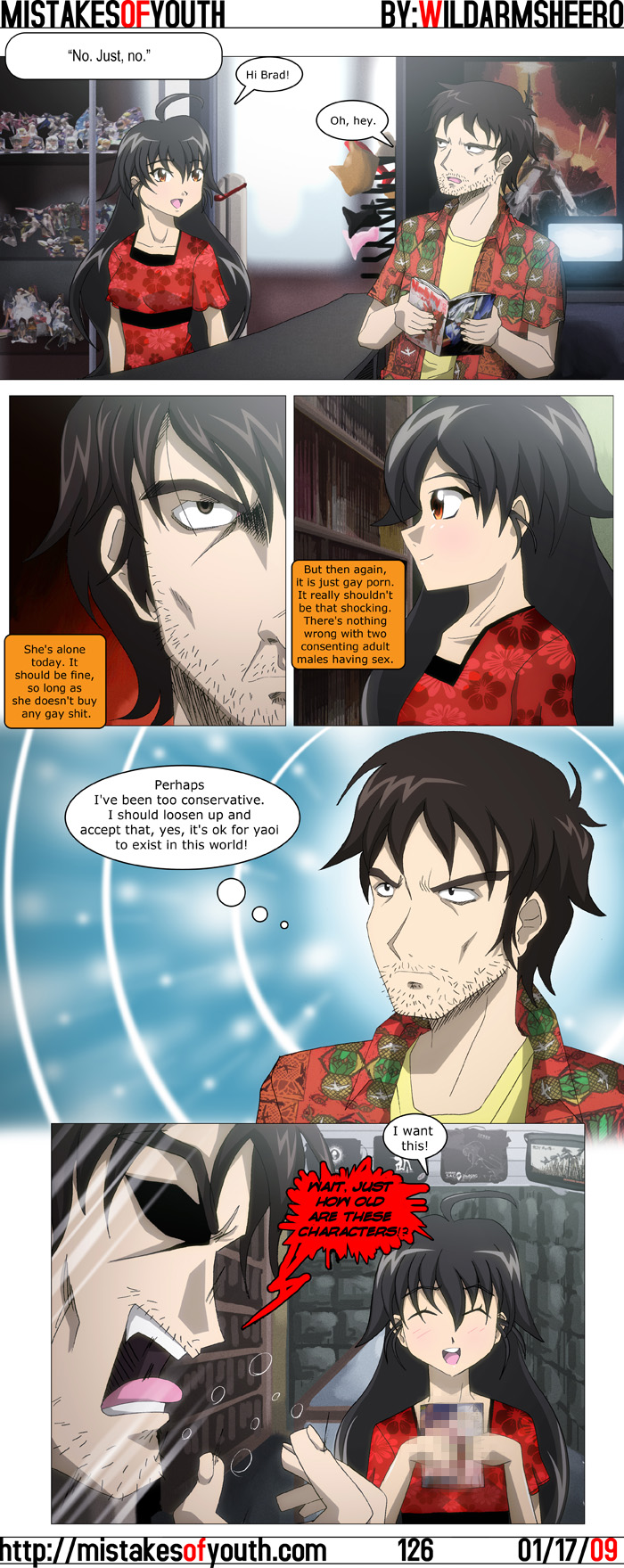 Oh god, here's another comic. I really liked the sketches for this one, but as I continued I started to like it less and less. Looking at it now, I'm pretty indifferent towards it. It could stand to be better, but I don't hate it. I tried some new things, like correctly sized heads and conventional panel layout, and they work pretty well. The backgrounds are the usual mess of bad mouse painting mixed with pictures I steal from Google images and Tokyo Kid's official site (which seems to be down at the moment, hm.) I don't think I've made this clear, but I do steal a lot of images when I make comics. I know this is fairly obvious, but I figure I should make it known that I'm not pretending all of Brad's Hawaiian shirts are my own designs. They're all stolen. But lots of artists appropriate imagery in similar ways, so I don't feel too bad. Oh yeah, speaking of stolen images, I'm not going to provide an uncensored version of this comic just so you can see the horrible shota shit Tina is holding. If you really want to see it, hit up Mandarake's shota section. It's like the second book there. I didn't want to hang around too long, that shit is gross. Another podcast came into existence a day or so ago. It's me, Omo and Link going on for about fifty minutes about that show everyone has been ripping their manga up over. I'm going to try and do a show with Senor Link again about that Touhou cartoon Maikaze released a while ago. That'll be neat. I mentioned last rant that I threw together a little doujinshi on a request from a friend. I got some requests to buy it from some people over the last week, but before we can print anything we need at the minimum thirty requests. We're not quite there yet. It's only three bucks, and it's pretty funny even if you haven't seen the series in question. So buy! Buy! Buy! We can also do digital copies, but if anything's going to be printed, we need at least thirty people. I did my first bit of fanart for 2009, and once again it's a picture of Chiaki being touched in a bad way. I did this at the beginning of 2008, too. I have no idea why. I'm not even that wild about Chiaki. I mean, she's cute, but not one of my top 5 lolis or anything. Oh well. A bunch of cool anime has started, and the coolest is probably Maria+Holic. I don't want to say too much, as I'm already planning on saying a bunch in a future season review post, but it's pretty good. It's not really as crazy as I want it to be, but what can you do? The opening is pretty rad. Anyway, we're at the end again. Later. |