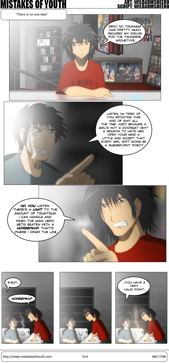 Now I'll have this to protect me from those cold Boston nights when the heater doesn't work! ----------------------- I actually think the horsewhip is pretty funny. Yeah, this comic has hit a new low. There's not even a joke here. Of course, right after I finished this I came up with an idea that was a lot better and relates to a rather big event that happened recently. I guess I'll draw that one up for next week. It'll be less relevant by then, but this comic has never really been up to speed, so whatever. The art here is pretty good, probably the high point of the strip. I tried to get a cheap laugh with the last three panels, as you can see. That only came about because I forgot to draw in Brad's cigarette for that one drawing. In other comic related news, I just recently learned that I've actually reached the demographic I've been aiming for. I recently got an email from a member of Something Awful's forums who posts on ADTRW saying that he's a fan of the comic, and then went on a bit of a rant on how Zac Bertschy is an asshole. I also found out that one Randall Fitzgerald is a fan of the comic, and he even plugged it one of his posts. I guess that means I have to stop making crappy comics like this one now. Anyway, on to anime. I am so glad I got IGPX on DVD. The video quality is just so much better than the crappy television broadcast, and I much prefer the Japanese over the English dub (though the dub does feature The Legend Mark Hamill.) I'm also liking the extras, even if they are focused on the US's production of the show. I like the interviews with the creative/technical staff over the ones with the dub actors. I actually turned of Michelle Rodriguez's interview because her stupidity was too much for me to handle. Either that, or I just really hate her voice. Probably a bit of both. Mark Hamill's interview, on the other hand, ruled. I'd like if they had some interviews with the Japanese staff, but I highly doubt that'd happen. A textless opening would be nice, too. I've decided to start following Blood+ raw until the end. Shinsen's finally caught up, but due to their "four episodes at the end of the month" routine, I think it'd be better to just follow it raw from now on, and download subs later. I've noticed the production slipping in the past couple installments, but things seemed to get back up to standard in episodes 42 and 43. I guess it's natural for a show of Blood+'s length to be more susceptible to production slipups, even if IG is at the helm. Then again, another one of IG's currently running works is a COMPLETE production slipup. That's why I dropped it. It genuinely confuses me as to why people aren't watching Zegapain. While its animation is a bit under par, the story is positively compelling. Well, maybe not positively compelling, but it's interesting enough for me to keep watching despite the sometimes below standard animation. I still wish the mecha fight scenes were animated with regular 2D animation. I really don't like the Zoids-esque battles. They just lack the kind of intensity that can be achieved with regular 2D animation. Fucking low budgets... Innocent Venus is off to a good start. I have to say it that it mixes 3D models and 2D animation a lot better than Zegapain. Actually, the animation looks pretty good on all fronts. I'm liking the survival story matched to the post apocalyptic setting so far. Action scenes are brutally realistic, almost GITS level. I like the characters, too. It does help that there is a cute loli in the cast. Actually, that could be why the entire cast has won me over. Yeah, I'm shallow. Also, the opening sequence is pretty cool, despite it taking some shortcuts. That's about it for this week. In about 2 weeks from now I'll be posting from college. I'm not sure how my college schedule will effect comic production, but let's hope it doesn't hinder it too much. god i