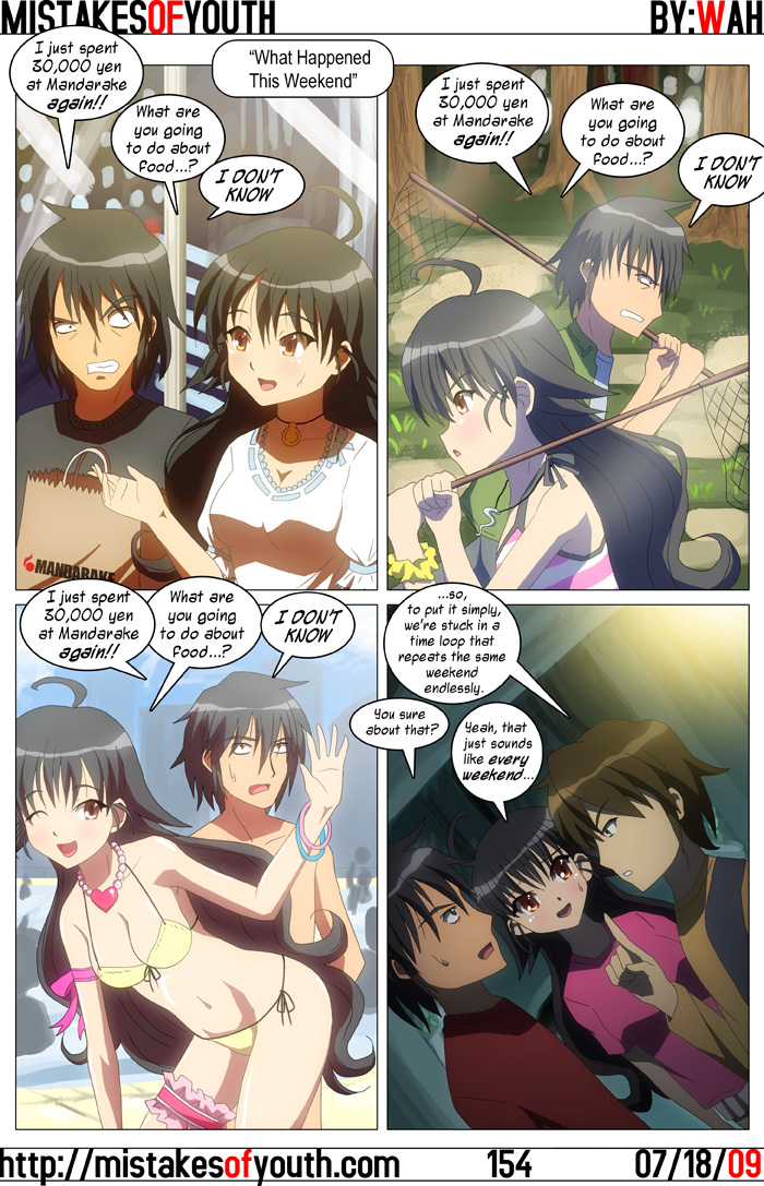 This is the second Endless Eight related comic I had in mind. I really like it, even if the punchline is really corny. That probably just makes it better. At first I was just going to draw them on the train in different ways, but then I decided to parody Haruhi scenes after the first panel. Also I really wanted to draw a girl in a bikini. The art is fine, I suppose. Awkward looking, but not horrible. I put more attention on the difference between colours in each panel to suggest the lighting situation in each, but they all didn't turn out just as planned. Oh well. Speaking of Endless Eight, that Yamamoto Yutaka guy is at Otakon right now, and at his panel he gave his 2 cents on the whole thing. I can't repeat it, but if you know someone who was there, ask them about what he said. It's not super interesting, but it's neat to hear his view on all of this. I really do hope they stop at the initially rumoured six episodes. The latest cycle had some really good animation, so that leads me to believe that they may be working their way up to a finale. It is a clever arc, but considering the nature of it, it does quite obviously get a bit repetitive. Also, one of my fears has been clearly realized during this arc--that is, not-so-hardcore fans jumping off of the wagon. I can't blame them, but comments like "fuck this show" are just unintelligent and don't do well to make it seem as if you know you're on about. I've spoken to a few of my Japanese friends about it, and while they want it to end, they seem chill about the whole thing. I've been watching Umineko No Naku Koro Ni on the recommendation of a friend who lives in the same guest house as I do. Some people have been pooh-poohing this show all over the net saying that either the game is better, or the whole affair is just stupid, but I like it. The presentation is appropriately over the top, and the story is rather engaging. People have been getting on the show's case for its animation, but I already knew going into this that it was Studio DEEN, so I'm not put off by it too much. In fact, this show looks fairly good for them! The colour palette is still rather bland, though. I kind of want to watch Higurashi now... That'll be all for this week. I have a comic planned and sketched for next week, but I'm not sure if it's any good. Later! |