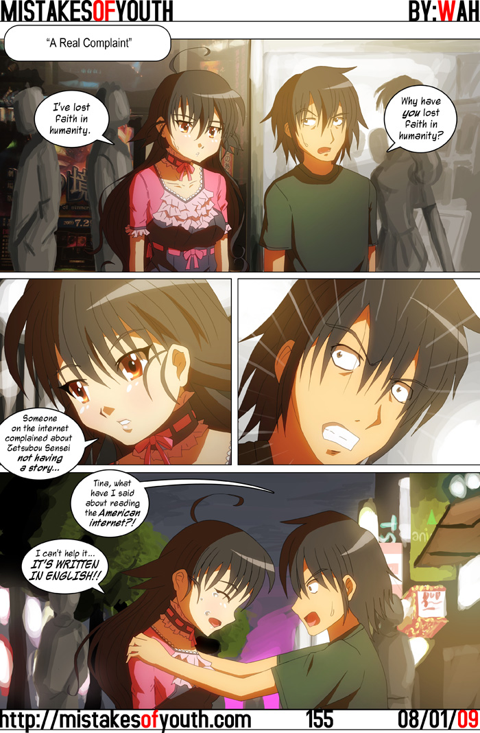 This comic is most probably not terribly funny, but it addresses something I feel needs addressing--which is fans (typically of the English-speaking persuasion) expecting unreasonable things out of certain shows. This is an extreme example, and I don't think this opinion is widely held (if it is, God help us all) but someone on the internet actually said "Sayonara Zetsubou Sensei is a filler series, there's no plot or character development." These misguided comments that demonstrate the sheer lengths to which less enlightened people can miss the point do well to inspire inklings of rage within me, and as such elitist comics such as this one come into being. I'm sorry! I don't think I'm even going to comment on my artwork anymore, since in every rant it just boils down to "I should do better." I guess I'll only really comment when a comic turns out horribly. How about that? On to anime. I mentioned Umineko two weeks ago, and since the first arc has ended I figure I'd bring it up again. I haven't gotten around to reading the original (visual) novel, so I don't know how exactly things go down, but the end of that first arc was a bit of a let down. I'm usually forgiving towards what people dub as the "anime ending", mostly because I watch shows more for the strength of the characters, directorial work and animation. Plot only really comes into the equation when it overshadows the characters due to how involved it is (a la Death Note) and Umineko was shaping up to be one of these affairs. As such, I was a touch let down by the way the first arc ended, as it didn't do much to really tie the murder mystery up in an interesting way. It's not like I hate the show now, but for an anime in which plot is the only thing going for it (the animation is pretty muddy) it's a bit of a downer. Keeping with the theme of the sea, Umi Monogatari is another show I'd like to talk about, but not in a devoted blog post. It's a pretty interesting setup--the first episode alluded to it being some supernatural and slow slice of life show, but it's actually a magical girl show. I think it's a quite enjoyable and well put together production. The character designs are quite nice (I do appreciate how little the girls wear, and I miss Urin's bikini) and are complemented by really smooth animation. Sato Junichi's direction is slow but not the kind that puts me to sleep. The characters are amusing, and the story is a good excuse to have some creatively choreographed fight sequences in each episode. One thing I really like is the soundtrack, which is by Kure-nai composer Muramatsu Ken. It's his typical jazzy, mostly piano driven stuff but more of the same from this man is not a bad thing. I still need to actually buy that Kure-nai OST. I mean... it's fuckin' awesome... That'll be it for this week. While I don't have a comic made for next week, I have no excuse for there not be one since I'm out on my ass for the next two weeks. Sure I'll be doing a lot of sightseeing before I head back to Amerikkka, but I'll probably have time to sketch out a few more comics. Have a good weekend, and don't get caught in any timeloops. I hear they're especially dangerous in August... Later! |