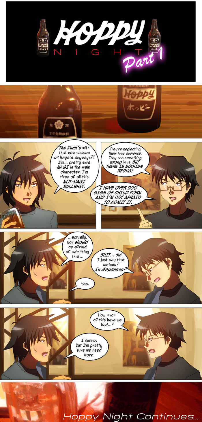 And they said it couldn't be done! Three comics in one week! Of course I made these two at the same time, but details, details. To get the full effect of my bold artistic vision you have to imagine those title cards fading in along with the sounds of people drinking and eating, all while matched to Showa-era Japanese pop music. I put a lot of work into making the title cards look as tacky as possible, especially the second one. For the first one, please imagine the glow around "Part 1" flashing on and off, and for the second one imagine the lettering coming in with bouncy, cheesy animations, while the "Part 2" tilts up and down. I guess the only joke across both of these is that everyone is getting drunk off of Hoppy. Well, except for Brad. Brad's gotten so used to drinking to forget that his constitution stronger than any other man's. He's drinking the Shochu straight. I've been actually meaning to use that script in the second one for a while, but never found a good opportunity until now. The last panel for that one is a little sloppy, but I enjoy how Brad's expression turned out. I wonder how he even ended up at that drinking party anyway. With luck there will be three more comics next week, which'll round off the Japan Arc. Until then... |