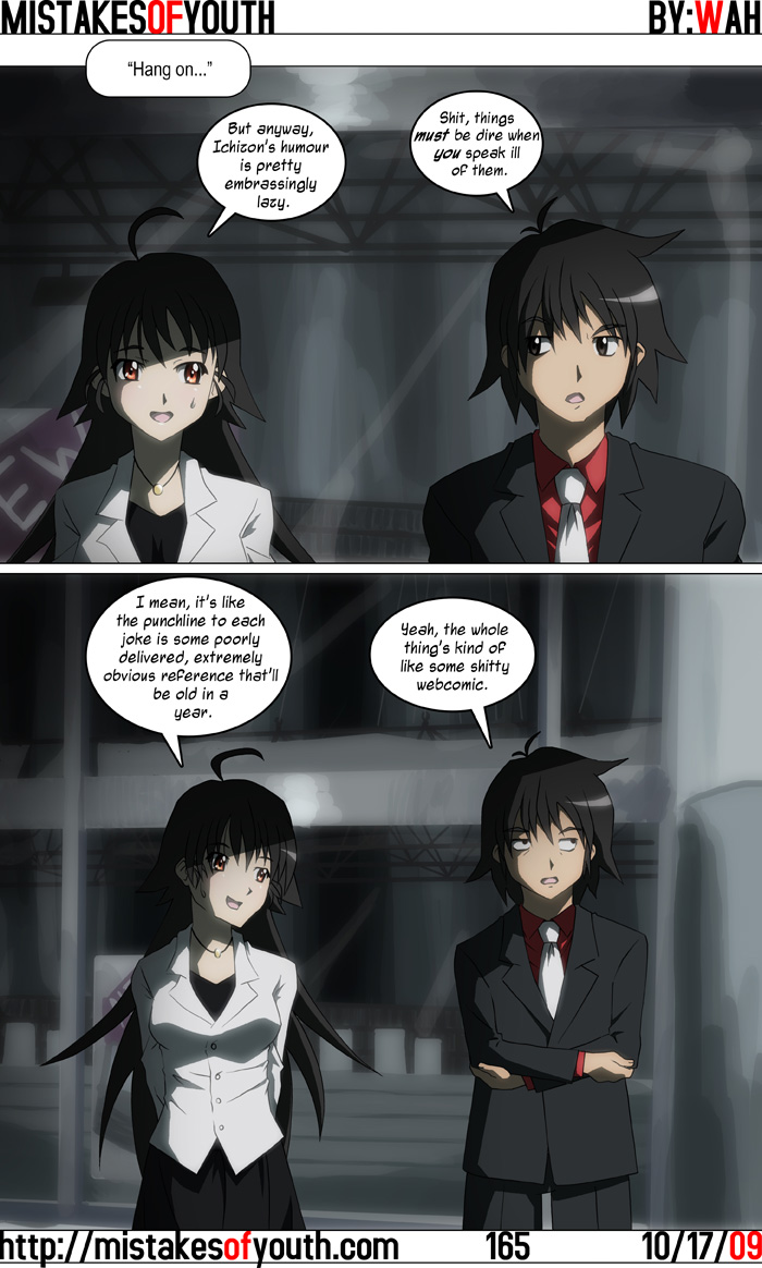 You know things are dire when your own characters burn you, amirite? At first the characters were going to be taking shelter from the rain, but the background didn't make it seem like they were obviously standing under anything. As such, without a rain effect, the colour scheme for this comic makes it seem as if the characters have fallen into some cold, dark world where everyone dresses in business casual. I like it. I don't so much like the lineart, but it can't be helped--this is a shitty webcomic, after all. I forgot to talk about the kind-of-recently-announced Haruhi movie last week, so I figure I'll talk about it now while it's on my mind. When the rumour first dropped I wasn't all that keen on the idea of a movie, but now that the news has turned into something real, I somehow went through a sudden change of heart. I think the only thing that would affect the movie is pacing, but if it runs at 2 hours or so, it should be fine. I only regret that I probably will not be able to see it in a theatre. Movie budget KyoAni animation on a big screen will surely be a sight to behold. Anyways, that's all. |