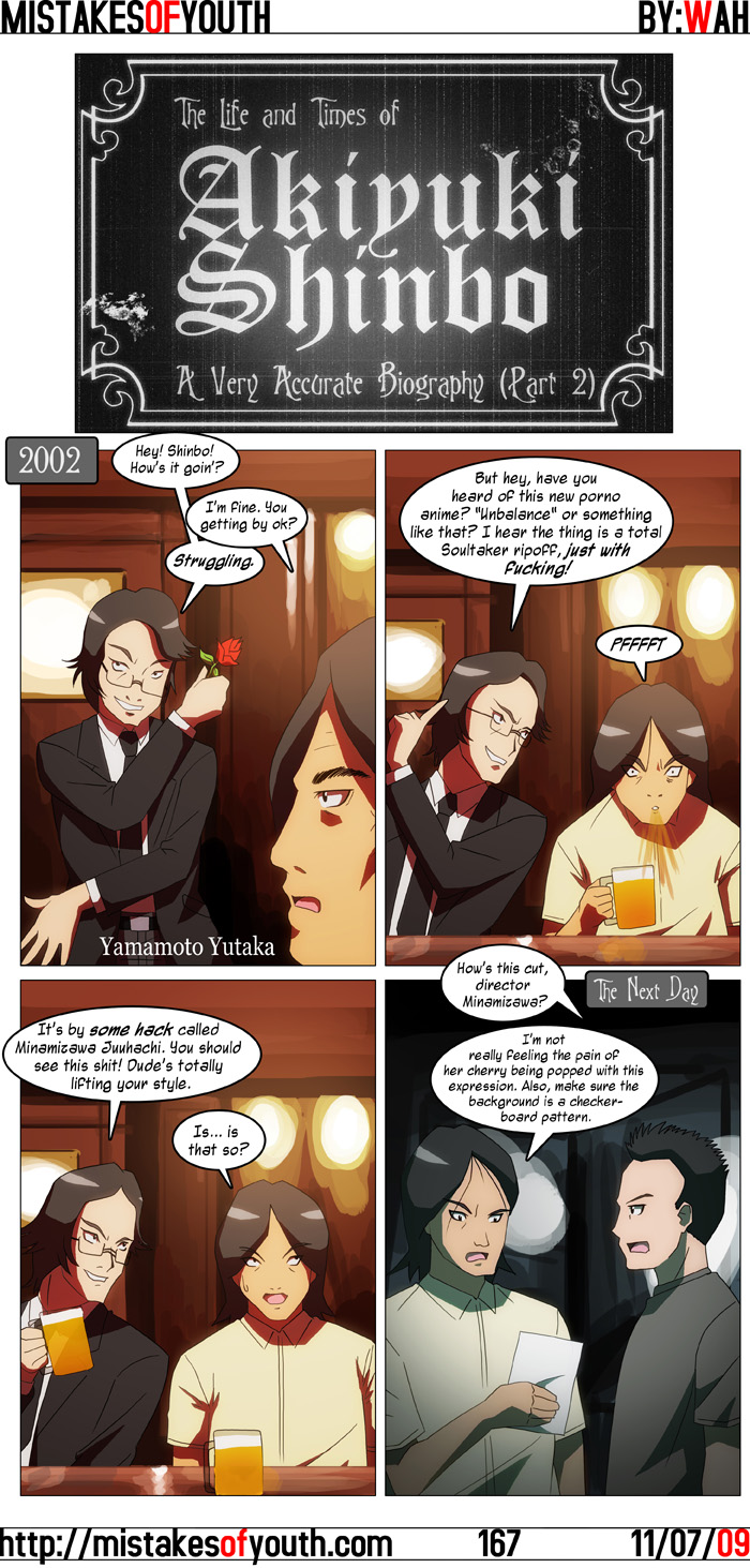 This is one of them comics that only me and few other people will get. You can probably still derive a laugh from it, but you kind of need to know about this guy called MINAMIZAWA JUUHACHI. See, this fellow MINAMIZAWA JUUCHACHI (his given name means "18") directed a bunch of ero anime in the early 2000s. The interesting thing about some of the ero anime he directed was that they looked very similar to the works of our beloved Shinbo Akiyuki. Furthermore, one of the studios that produced some of these works is said to be the alter ego of studio Shaft. So, basically, Shinbo probably directed porn. I've seen it. It's pretty trippy. But man! A year since the last Life and Times of Shinbo. The art kind of got better, but these last two panels still look a bit wonky. I have to say, I do quite enjoy my depiction of Yamamoto Yutaka. You have to note that this comic takes place before he got famous, which I think makes the attitude I forced upon him kind of funnier. Maybe he simply knows he'll be famous one day. I don't know if Shinbo and Yamamoto actually speak to each other as friends, but Yamamoto does talk about Shinbo all the time. I don't have much else to say, so I'll leave it at that. No idea what to do for next week! |
