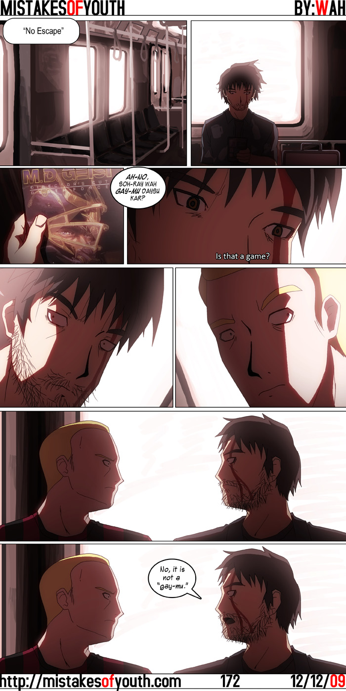 There was a comic before this one that I put up on Wednesday. If you don't happen to follow the RSS feed and just reload the site on weekends, you may want to go back and see that one. This is something that happened to me in real life. I've been wanting to use this anecdote as a comic for a while (something like three years) but never really found the right moment until now. I feel that Brad, after having been washed ashore in America after a grueling number of months manning the cash register at both Tora and a U-15 DVD shop, would be absolutely delighted to hear some American guy ask him if his MD Geist DVD was a "gay-mu". In real life the man who posed this query to me was less of a Hitler dream child and more of a brown person, but I think portraying the assailant as he is in the comic enhances the humour. The art isn't really up to par. The drawings are lazy and the lighting didn't come out as I wanted. I'm still really bad at determining where shadows fall, too. Also, you'll notice Brad isn't bleeding anymore. I forgot to add the blood, so just assume he wiped it off. I dunno what's going on next week. I guess I'll figure something out. |