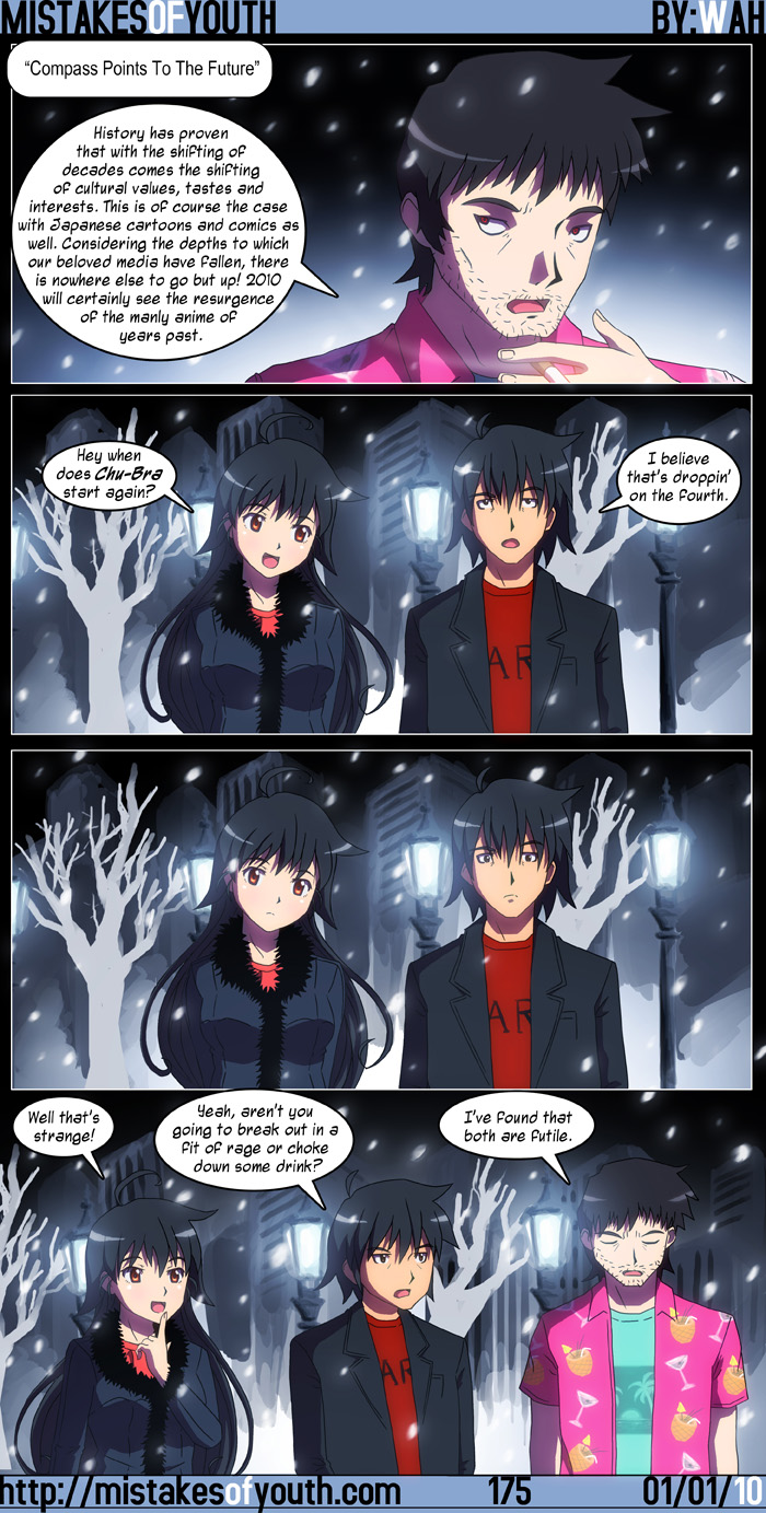 For the first comic of the DECADE I suppose this could have turned out slightly better. The colouring came out well, but the actual drawings leave something to be desired. Considering it was drawn last year, it's not the first comic made in the decade, but it is the first posted. Hopefully the next one will be better! Happy New Year! |