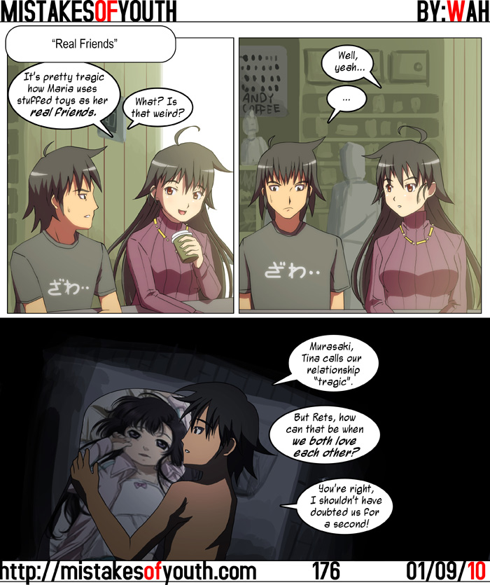 They're talking about Umineko, just so's ya know. Maria's plight seems to have struck a chord in Rets, but he didn't realize that her situation was meant to be tragic. You can't blame the guy--he's picking up all those little fragments of happiness that other people ignore. Or whatever. For the first comic MADE in the decade, this looks lame too. Oh well! The next one is sketched out and it looks kind of better. Should be funnier, too! Not much to say here (is there ever anything to say these days?) but I've been blogging up a storm on the blog. Pretty sure I updated like 10 times this week, and I plan on updating again today! So check that shit out! |