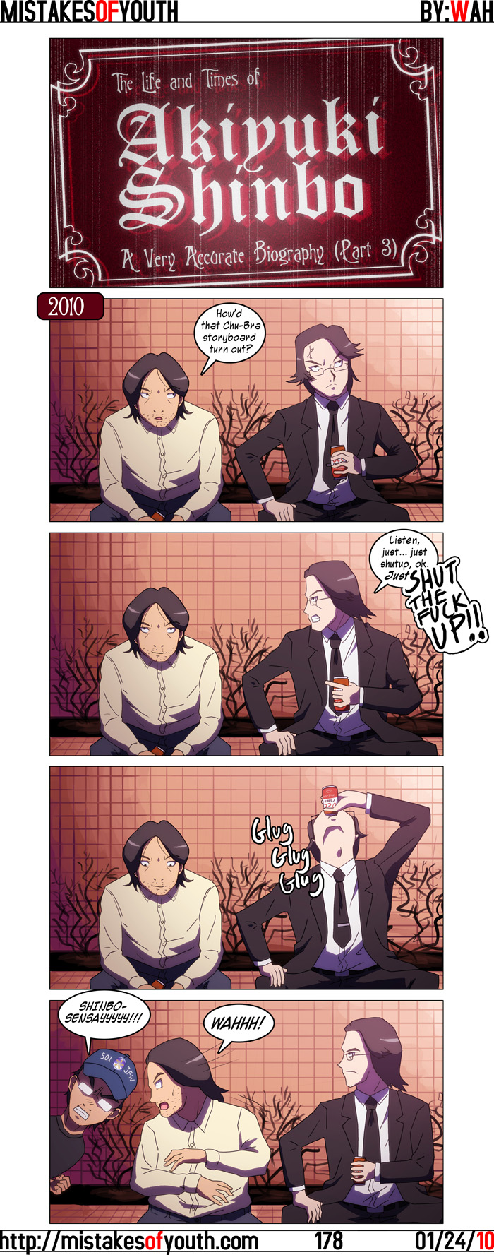 After running this comic by a few people last night, my hypothesis that I'm the only one who finds this comic funny was proven to be correct. It's not terribly funny unless you find Shinbo getting on Yamakan's case for storyboarding an episode of Chu-Bra funny, and I find that hilarious. I also think it's funny for my cartoon avatar to pop out of the corner of the frame in his continuous journey to stalk Mr. Shinbo. While I'm on the subject--and since I don't think it really deserves a focused blog entry--Chu-Bra is somewhat disappointing. It is a little interesting how it's taken a less fanservice driven route (don't get me wrong, it still has a lot of panty-shots) and has instead decided to focus on the embarrassment that young girls feel about wearing underwear, as well as the mechanics of underwear. It's interesting to make a show about these things in theory, but in practice it kind of falls flat, especially when I don't find the characters to be that enchanting. So long story short, the show should be more about fanservice. I may stick around for Yamakan's episode, but I'll probably drop it. That's it! There may or may not be a comic next week. I haven't sketched anything yet so I don't know! (Get it? He said "wah!") |