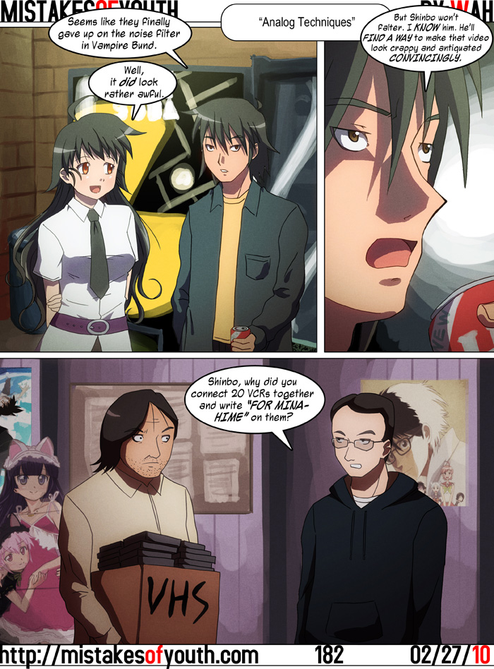 Yeah, yeah, yeah. Another comic about SHAFT and Shinbo. Next week is probably going to be about them, too. What can I say, they make great cartoons, but they're also hokey enough that I can make fun of them. But speaking of noise filters, the more acute of you may notice that I have been applying it to the past couple of comics. I'm doing this because I think it gives the art some texture. It looks good on my screen, but I'm not sure how it looks on others. It'll probably come and go according to my mood. Also, I realize I've been rather quiet on my blog lately. I don't like apologizing for not posting, as I feel one should post on their blog at their leisure, but there's things I want to talk about and it's simply a matter of me sitting down and typing them up. This is impossible, but I'm going to try and shoot for three Actual Entries (ie, not art or comic rants) a week. I also have some more podcasts to get out, but Audacity being the influriating program that it is has caused me to make negative progress. Oh, and just so's you know Mistakes of Youth will be at Anime Boston at the beginning of April. NOT ONLY THAT, but if you read my Twitter (don't read my Twitter) you would know that I have a panel there. It's going to be called The Life and Times of Akiyuki Shinbo. It's on at 7pm on Friday in panel 309. That time and place my change, so Watch This Space for any changes! Anyway, hopefully I can drop some more interesting words on you guys soon. Later! |