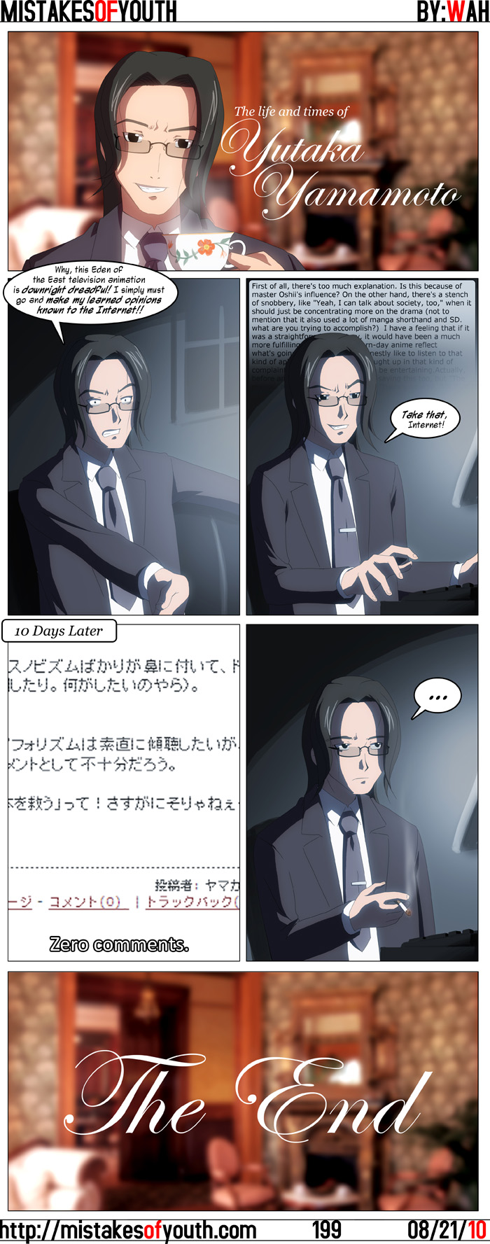 This review is actually real, and you can read in its original Japanese here. As you can see from the actual post, it actually has a substantial amount of comments, but it wouldn't be funny if I actually did that. Thanks goes out to kransom for translating that review for me. This comic turned out better than I expected after doing the sketches, but it's still not very good. I think what bothers me the most is Yamakan's hair--it being divided into two giant locks on either side doesn't seem very natural. Hair is one of my many weaknesses, but I was thinking I was getting better at it in the last comic. The next comic is the 200th. I kind of have an idea for it, but I want to artwork to be very good, so that may delay its release. Later! |