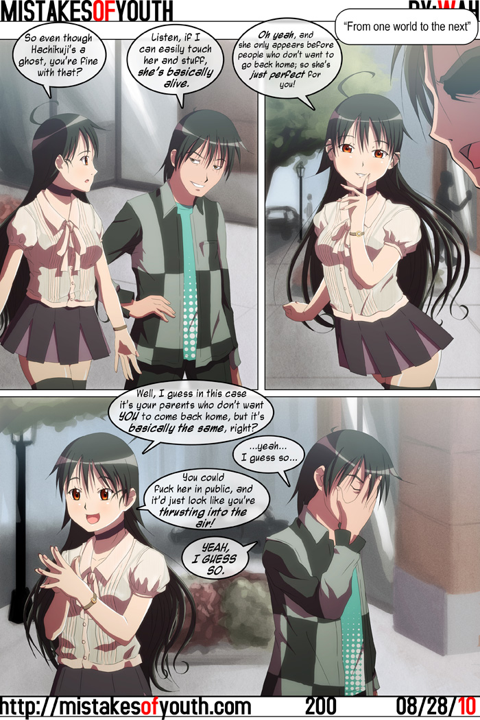 Well here it is, Mistakes of Youth's 200th comic. In the end, it didn't really turn out as nice I wanted it to. After looking at it for a while, and having it run by other people's eyes, there's a bunch of things I'm pretty unhappy with. But overall I feel it's not too bad. I don't remember if I've done a Bakemonogatari-centric comic or not, but I figured I'd do one now since I'm still a bit high off of the end of the series, and I am rather fond of Hachikuji. There is actually a Hachikuji doujinshi in which the punchline is Senjougahara looking at Araragi in disbelief has he thrusts into the air. That said, I'm not sure if anyone but me will find this comic all that funny. I've been trying to get posts up on the blog in a regular fashion lately, and for once managed three posts in a week. One is a BLACK★ROCK SHOOTER review, another is my lame tribute to Kon, and lastly I looked at some C78 trailers from a few weeks ago. I do have lots of things I want to blog about, but it's just a matter sitting down and doing it. Maybe if I can swing three posts a week for three weeks, it'll become a habit. Anyway, that's all. Later. |