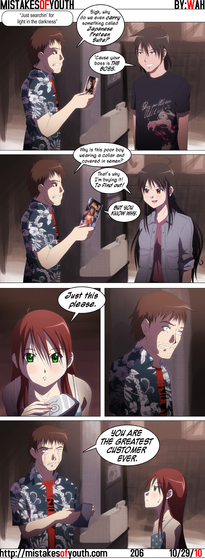 I don't really know what kind of point this comic is trying to make. Maybe it's just to put things into perspective? I don't know. I think it's a little funny. This is the first time I've done a comic completely digitally, start to finish. As a result, the size of the characters is a little out of whack since I did the sketching on the computer, and I don't really have good sense of scale yet. Anyway, things have been kind of busy over here at Mistakes of Youth HQ, but I'll do my best to keep things running. There's a bunch of stuff I want to do, as always, just a matter of doing it. Later! |