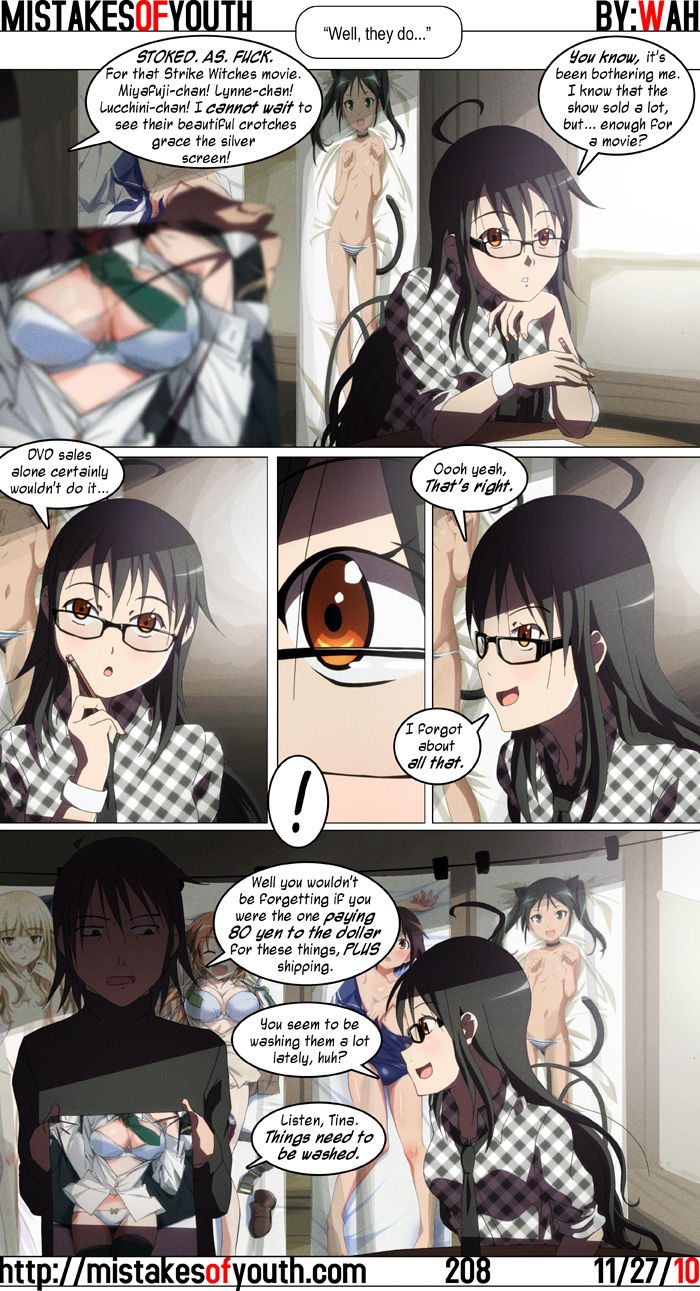 In retrospect, I probably should have drawn a subtle stain over all of the girls' crotches, but alas, it is now too late. This comic was meant to come out a week after the last one, but some things happened, and I only managed to get around to drawing it a little while ago. Seems the news of the Strike Witches movie didn't make much of a splash anyway, so it's not like this comic being super out of date is really a big thing. This is another one that I did completely from start-to-finish on the computer, and looking at it now, I'm not unhappy with it. The part I like the best is Rets' face obscured in shadow, as he's folding his dakimakura, whist wearing an evil-looking black turtleneck. Anyway, with school completed and my internship over with, while I'm looking for employment, I figure I'll use some of my free time to revamp the site. There's gonna be some big changes in the near future, so look out! For one, expect a new blog to surface soon-ish. That is, once I get around to designing it. By the way, I started a Formspring account, so feel free to shoot me whatever questions you have! See y'all later! |