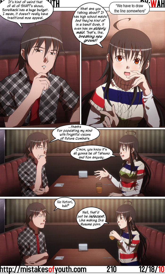 Someone I know has a theory that a friend of mine is the inspiration for Tina. While this is not true, this time his words are the punchline for this comic. I find it amusing that in a culture in which all manner of otherwise innocent characters are raped in the minds of horny young men, a concept of certain characters being off-limits amuses me. Certainly, that doesn't stop people from drawing Cardcaptor Sakura's Sakura being raped by faceless men, and there's already a slew of pictures depicting Ika Musume's naked semen covered body; but there are people out there with standards. I think it's a little funny to bring that kind of sentiment into a comic such as this, where generally nothing is sacred. Not super funny, but a little funny. I wasn't shooting to high with this one. Speaking of high, saying SoreMachi has a "huge" budget is kind of misleading. It has a huge budget for a SHAFT show, and as a result more or less moves like normal anime. That'll be all for this week. Let's see if I can throw together a Christmas-themed comic by the 25th... |