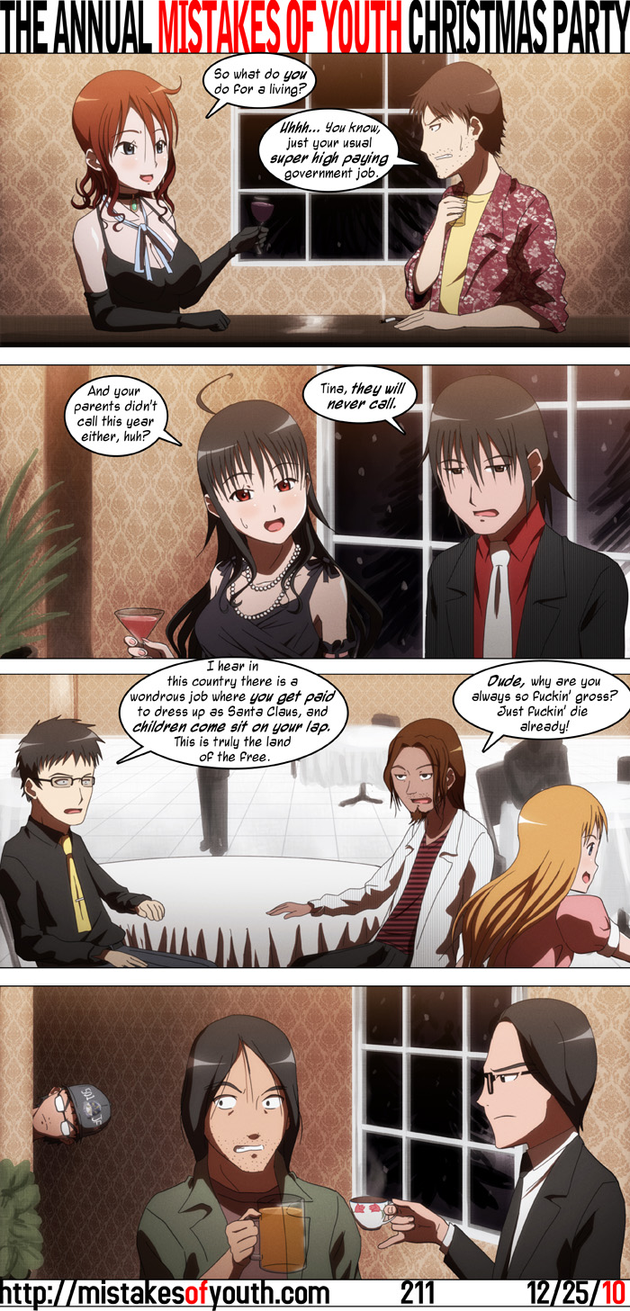 I liked the party last year, so I figure I'd do it again. It's easy to do, and I like drawing people in formal wear. I don't know who puts on this spectacular Christmas party--which is apparently too good to have Christmas decorations up, save for gigantic pine trees outside--or why they invite the people they do, but it must be a blast. See you all later, and Happy Holidays. |
