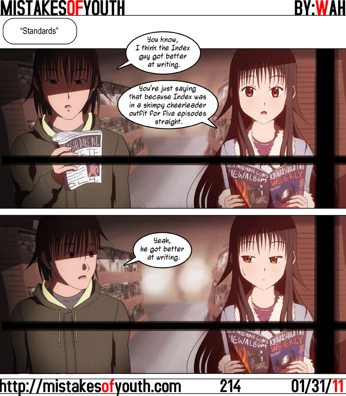 This joke is newspaper funny pages quality, and I didn't feel like being too inventive with the art. But you know, each time I watch something related to To Aru Majutsu no Index, I have to say something. |