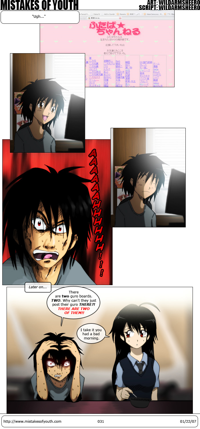 Now I know what Patrick was referencing here. More on this later. First I need to talk about some comics. I'm going to backtrack a bit and talk about the comics I neglected to comment on because I was too lazy. First off is comic 29. I wasn't so sure if people were going to laugh at this. In my mind it was only funny for a second, then I realized it was kind of lame? People liked it though, so that's all that matters. The art is ok. The background in the first panel is really kind of sucky. I can't get the details down well. They are supposed to be a subway station, by the way. You know, one of them nice ones with news stands and stuff. I'm quite happy with comic 30. Save the first panel (tried to be a bit too ambitious there) the rest of the comic looks fairly good, and it's funny! Mashimo probably wouldn't appreciate me portraying him like a raging drunk, most likely because it is true. God, Bee Train. The newest comic is one of my lazier ones. Backgrounds are kind of bleh, and so is the character art. Especially the screaming panel. Ugh. I tried for LOL FUNNY DETAILED FACE and failed this time. But the joke makes up for all that? This is totally true by the way, too. I hate my life. In other comic news, I got some hawt fanart, which you can be viewed in the fanart section. Podcast in the works maybe? Trying to get a new speaker on. We'll see how that goes. Believe it or not, I just watched all of the original three Gundam movies for the first time this week. I've never actually finished the TV series (watched on CN dubbed back in "the day" before it got cancelled and now following the fansubs.) I am happy to actually see the fucking end of it instead of just reading summaries or looking at screencaps. It was, how can I say, totally epic? While they were kind of rough around the edges on the technical side of things, these three movies cut all the crap from the TV series and tell a tight, gripping, war epic. Some small things could have used fixing, like certain important events weren't built up enough, and M'Queve was delegated the role of "glorified officer who is actually not very important to the plot." But, honestly, these movies are great. I'd recommend them to anyone. Now, the Zeta movies on the other hand... I'm watching Cardcaptor Sakura for the first time, too. I can't say much about it now because I actually haven't watched it much in the past week due to various circumstances, but I'll get back on it. I really like it though. Very MOE and whatnot. But moe with heart. Not produced moe. Sakura is so cute. In other news, I've already accumulated 200 megs of CCS porn :) Um. I'm also reading the first Haruhi novel. Yeah. Finally. That's it really. Don't have much writing drive today. I can try and guarantee a comic for next week. I already have a script idea, just a matter of drawing it. |