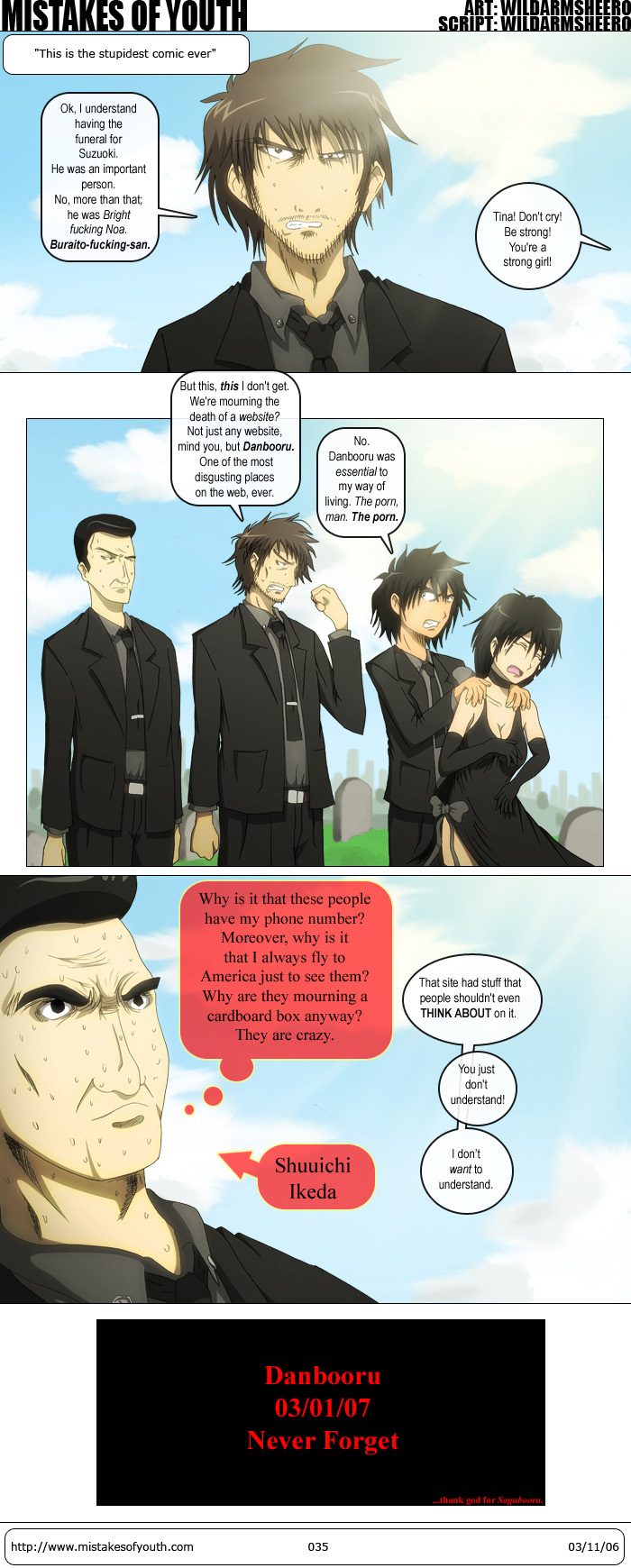 Yeah, I don't feel like making an avatar for this week. I think I'm allowed to be stupid every now and again. I mean, I'm not going to lie, this comic is fucking stupid. Certain comics have been stupid, but this is just... really stupid. Why is Tina even crying? That site had little to nothing for girls. Please, take this comic as a very "what if" situation. Which is to say, pretend that it didn't really happen. Or something. Though, I did really wanted to do something about danbooru, given its significance to US Otaku culture. Sure, we have sagubooru now, but danbooru was the original, and must be remembered. Anyway, writing woes aside, I do like the artwork. I especially like how Ikeda's face came out in the last panel (also, yes, he did make an appearance in a previous comic.) I enjoy drawing men in suits for some reason, so the guys were fun to draw. I had fun drawing Tina, too. I don't know much about dresses, so when it comes to drawing them, I just draw something sexy that I'd fap to, which is exactly what I did here. Sexual fantasy ftw :3 For those who don't read the blog, the first Otaku USA comic has been completed. It has Patrick's seal of approval, and should be appearing in the first issue of the magazine, which will be out in June. I'm quite excited about seeing it in print. I would like to post these same comics up on the site, but I'm not sure if I can do that. I'll have to discuss it with the publisher. If I can't then... you'll just have to find the magazine, or something. I am quite behind on this week's anime. Loads of school work and traveling have hindered any progress towards reducing the backlog. Most of the stuff on there is stuff that barely gets subbed anyway, so it should be fine. I kind of want to kick my self for not watching Kanon, though. I did watch a lot of anime today however, but it was all on DVD. One of the titles being Pani Poni Dash. I find I'm enjoying the series a lot more now without two-week to month long breaks between episodes. When I was originally watching the series, I kind of forgot about the characters between viewing sessions given the space between the episodes was so long. Now that I'm watching the show episode after episode, I can enjoy and appreciate their quirks more. The show is still as exhausting as ever. It's either because I'm laughing so much, or there's just so much going on. ADVs DVDs make the show more watchable, given they are not absolutely plastered with (multi-coloured) text like the fansubs, so that helps. Also, Becky is hot. Loli fashion o/ The other show I watched today was Gunbuster. I find Gunbuster to be quite a fun work. To be honest, the early episodes are quite amature. The animation is good, but still rough around the edges. The story telling is simplistic, and the script writing is quite corny at points. But it's kind of endearing. Watching the work of then young creators and animators, simply making something they like, chock full of inside jokes and fan-pandering to themselves. It's that kind of spirit that really makes the series great. The DVD itself is fine. Nothing flashy, but it works. I'm kind of wondering why a preview for episode four plays after the preview for episode three, though... that's kind of weird. DVD glitch? Will a Manga Entertainment-style recall be in order? Lately I've been reading the original Excel Saga manga. Three volumes in and I'm finding it less funny than the anime. However, I do find the humour to be more clever. Laughs are steadily building up throughout the course of volume three, but at this point it looked like Rikudo was still trying to find proper tempo and timing with his gags. Either that, or I don't get most of them. After all, Excel Saga is a commentary on Japanese society, so it's natural that a lot of the jokes would fly over my head (hell, a comic about American society would leave me scratching my head.) I do like it, though. It's very absurdest in nature, and I find that to be quite funny. Not quite Waiting for Godot, but you know. That's all for tonight guys. Oyasumi~ |