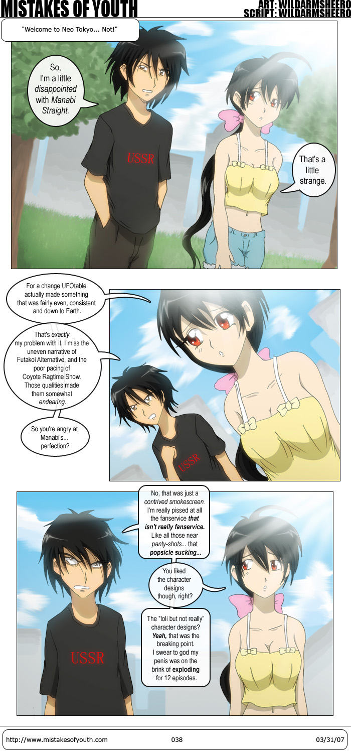 This comic has +100 wish fufillment points! Seriously, I drew a good half of this comic entirely with my penis. I don't know any girl anime fans, but I'm sure they don't all have nice bodies and dress in next to nothing. Sorry. I let my imagination get the best of me! orz But, being serious here, the art here is inconsistent. I am more or less happy with panels one and three. I feel panel two is a bit off, but it looks a bit better coloured (and with some light fixes from the original lineart.) I really tried to channel KyoAni here. Not sure how well I did. As far as writing goes, it's pretty normal. Normal meaning horrible as usual! Manabi Straight recently ended. People keep going on about how it had a satisfying ending, how it was great series and whatnot. While I do agree with them to a degree, I don't think this is UFOtable's best. Yes, it's a great little show, but it's missing the insanity I've come to know UFOtable for. I've only seen two of their other works, though (those being Futakoi Alternative and Coyote Ragtime Show) so maybe the rest are different? In any case, Manabi was far too down to Earth for me. Well, at least in my "I am watching a UFOtable show" frame of mind. I wanted that giant Akira explosion from the PVs to appear in the show! I wanted Momo to turn into a secret squid agent from Mars! I wanted something like that. But they fell short. I am happy with what came out though, but I'm just a tad disappointed. Oh well, I guess I can always re-watch Futakoi Alternative... Another show which recently "ended" is Code Geass. I put "ended" in quotation marks because the last two episodes are set to air sometime in summer, and second season airing at some point beyond that. The last two episodes have been quite shocking. Hard to believe episode 21 was the lighthearted school festival episode! Sure, all these developments are the direct result of Lelouch simply fucking up but I think we all knew it wasn't going to go smoothly in episode 22. I honestly have no clue where the story plans on going now (Jupiter?) but, we have to wait till SUMMER to see the end of it. >:| I watched Shuffle! Memories 12 yesterday. I haven't seen episodes 8-11, but that's fairly inconsequential given they're all recap. Episode 12 was nothing short of genius though. Why? It was basically porn. So good. Kaede was the best, as usual. I kind of wish there were more nudie shots of her, but we can't be too greedy. But yeah, one of the greatest anime episodes I've ever seen. Now, for some highlights.