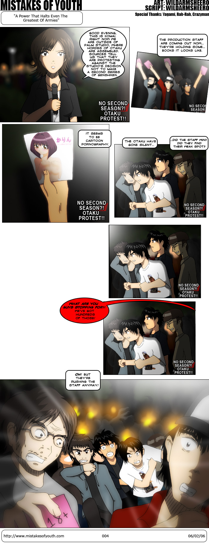 So. Genshiken. Here's a confession: I've never watched Genshiken. Nothing against the series, I've just never got around to it. So, therefore I'm not really the shocked that there isn't a sequel. This comic is kinda our first attempt at a new writing technique. I know, this isn't the best result, but we're still working on it. I hope it improves in the future. I mean...I don't think this comic is that bad.