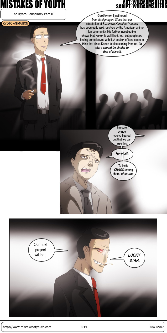 In which I pick up from where comic 40 left off. The end of that comic doesn't entirely suggest continuity, but hints at it and the title confirms it. I would have finished this arc back in April, but finals, Anime Boston, Gurren Lagann 4 and Genshiken II happened, so all those took priority. I suppose this little series of comics would be a bit more relevant 5 weeks ago, but that's how things go. I already have part III finished, and that will be posted on Wednesday. That's all really. Kind of have a headache at the moment, so I'll be off... |