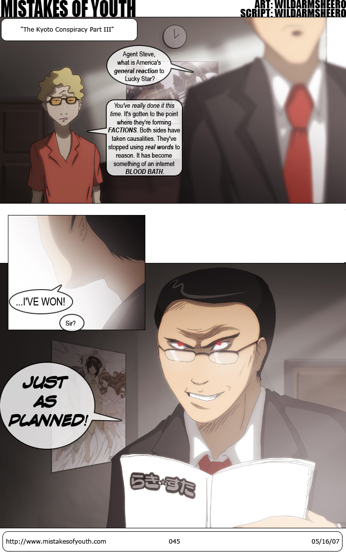 Someone told me that parody falls under "fair use." So does that mean I won't be thrown in the slammer for directly copying Death Note dialogue and artwork? I'm quite happy with how this comic turned out. I really like the first panel. It kind of got bogged down by text, but it looks nice on its own. This marks the end of the KyoAni arc. Will go back to regular gag comics now, though the next set of comics do have a hint of continuity also... Don't worry, I don't plan on turning this into Megatokyo. It's just nice to dwell on certain subjects for a little while. Also... ...sure hope all of you have had the distinct pleasure of seeing Colorful. Speaking of Megatokyo, an acquaintance of mine linked me to this. Aside from finding it quite funny, I do think there is a degree of truth in there. The layers explaniation really got me, and that's honestly where I believe the comic goes wrong. I don't agree with it completelly, but I think Fred is trying to do too many things at once, it really hurts the strip. It could be due to Caston's early influence that threw things off whack, or it could be that Fred just didn't know where he wanted to go with this at first. I still read MT, simply out of habit. 30 seconds three times a week isn't too much of a strain on my time, so I figure "why not?" Like last time, I don't have much to say. I'll come back in full blogging force later, but for now, I need to watch Lucky Star... |