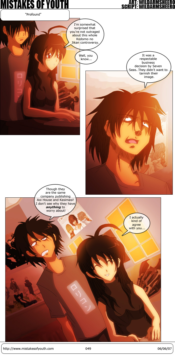 This comic is drawn fucking horribly. I kind of did it in a rush after the Kodomo no Jikan stuff happened. I actually had another comic (about AX) sketched out, but I really had to do something about this. Expect the comic about AX on Saturday. Talking of Kodomo no Jikan, some friends of mine have taken up translating it, and I'm typesetting for them. Expect chapter 6 soon. A couple of other comic related points to touch upon-- I recently got a nice piece of fanart, and just posted up another piece that I kept forgetting to post up. Also, I recently picked up a copy of Otaku USA. It's a neato mag. My comic is at the end. It was cooling seeing my work in print, but all I thought was, "I could do better." I'm kind of at a loss as to why they neglected to use my real name. I put it on the original draft, after all. I haven't watched a DVD in a while. Over the past week I've watched three DVDs, those being Haruhi vol 1, Karin vol 1 and half of Black Lagoon vol 1. The quality of all these really impressed me. A far cry from their fansubbed counterparts. They were all good stuff. I'll go into greater detail about Haruhi in the podcast I'm recording today with Gareth. That's it for today. With hope I'll have more to say come Saturday. |