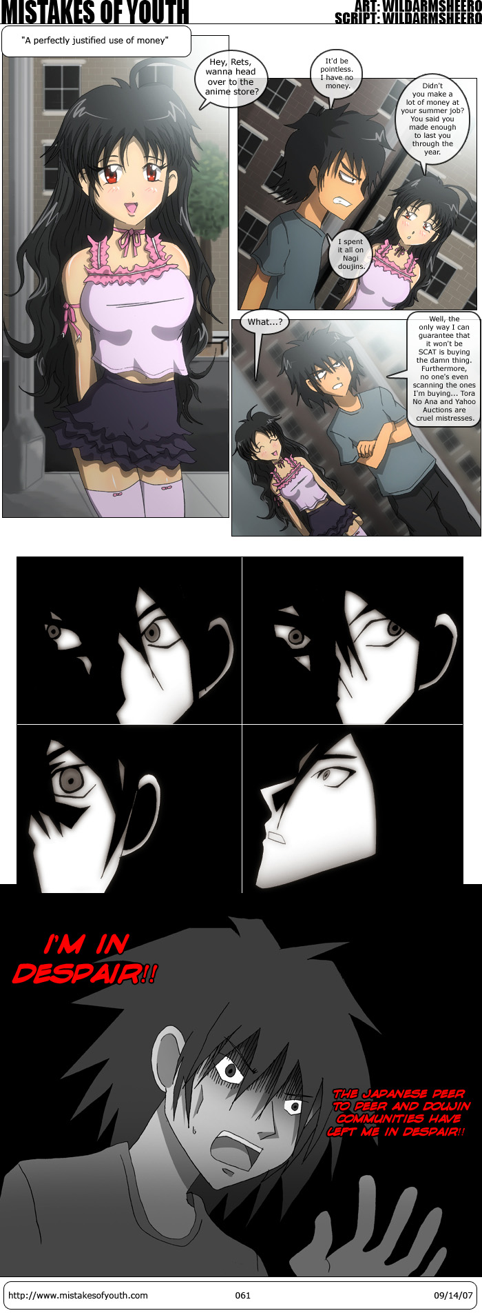 I bitched about Aoi House a long while back. I think I complained about how it was unrealistic portrayal of anime fans, or some shit like that. Well, I am a fucking hypocrite. I mean, at first Tina looked kinda dumpy, which would be normal for any anime fan. Now look at her. My logic was, if she's wish-fulfillment, I might as well fulfill some wishes. So after a while I started dolling her up. Played with various looks and styles, until she became the ultimate moe-machine, at least in my eyes. Of course, I have many different kinds of ideas of moe (most of which involve girls being under the age of 13...) Tina's look appeals to the moe in me that likes girls like Mikuru (or maybe I'm just getting thrown off by the chest) and her personality is very much one of a girl who I would like to have by my side. Well, I guess she could stand to have more of Konata-ness to her. This however depresses me. My shameless wish-fulfillment robs me of any artistic integrity I may have had. It's shameless, and I hate myself for it. Despite that though, the penis wins this battle, and I'll continue to make Tina as unrealistic as possible! Huzzah! Actually, please share with me your thoughts on my shameless wish-fulfillment in the comments section. I'd like to hear what you guys think. Now to the actual comic. I think everything came out pretty well. I had hard time nailing the Zetsubou Sensei style, but I got it in the end. I hope my utter copying of the screencaps counts as fair use, since they're in the context of a parody. There is a new podcast. It's Otakon chatter, which I finally got around to editing. I'm not as good as Patrick Macias when it comes to this kind of thing, but I think it turned out pretty good. This is the final podcast of SEASON 1. The reason I'm closing this one off is because while there are good episodes, it's kind of a low qualtiy production all around. It was a good way for me to learn the ropes of podcasting, and I hope to apply those lessons in the new podcast, Mistakes of Youth: BEYOND THE TIME. Look out for it~ I would write more, but I don't fucking feel like it. As you can tell from the lack of updates on the blog, school has been kicking my fucking ass. I'm going to try to see if I can drop one class to make it kick my ass less. Three studio classes are just too much... Anyway, until next time~ |