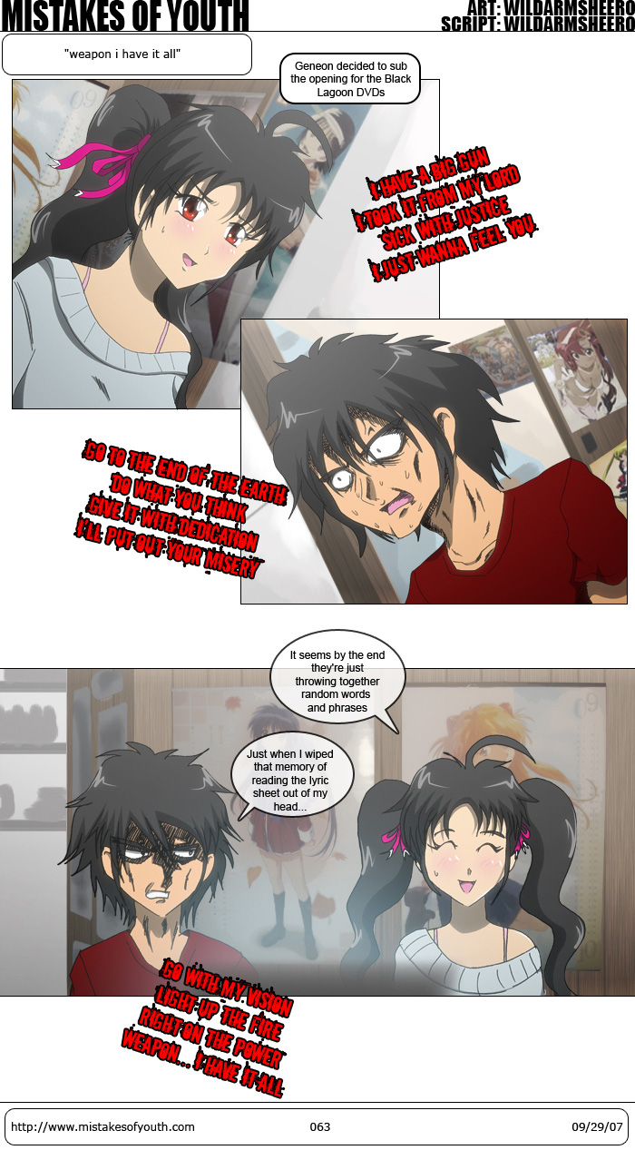 Funny I finish this comic right as Geneon's Nice Boat sinks. Ok, that was horribly forced. Anyway, this comic is a cheapshot, as usual. This should have gone up when I got my first Black Lagoon DVD, but I guess it took me a while to notice the subtitles in the opening. I forgot how bad those lyrics were. I kinda like the art. I wanted to make the colours a little muted, and I think it works to some degree. Expect a comic about Geneon's TRAGIC DEMISE soon(tm). Not much to say. I watched 6 episodes of Pani Poni Dash last night at MIT, which is a true test of Otaku endurance. I may do an individual post about the entire screening later, but I'll just say now that my energy gave out around the fourth episode. That show is exhausting. Also, I think I'm the only one who gets some of the sight gags, as I'm sure I'm the only guy laughing sometimes... I got the rest of School Days on deck. I may just finish it all today. I need to see this sick ending everyone is on about. So, with that, I am off. |