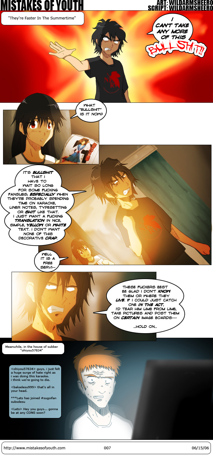 On Wednesday I'll be leaving to go to Boston for three days; college orientation and all that. I won't have time to make a comic, so expect the next a comic at least a week from now. I'm also working on some Ohno fanart that has taken longer that I thought it would... --------------- Wow, this comic doesn't suck that much either. The joke had a bit of re-working done to it; the comic was supposed to end with "that's all in your head" but CM thought that was unfunny, so he changed it and I agreed with him. However, looking back at that change today, it didn't really make much sense (he wanted to suggest that Rets was killing the fansubbers, but in the previous panel Rets admits that he doesn't know where they are.) I changed it to what it is now, so it has the same idea but still fits. Of course, the comic could be shitty all together. I dunno. I'll do better next week. Oh, btw, for anyone that didn't know: for emails regarding the site, send them to wildarmsheero (at) gmail.com. The old address won't work anymore. If you've sent any to the old address, re-write them and send 'em to this new one! For anyone going to Otakorn 2006, be sure to look out for us. We're going to have table yet again, and hopfully I'll draw up enough art to sell before then. Too bad most of my fanart is of stuff that's not available domestically (thus, won't sell). Guess I have to draw some gay'd out pics of Sasuke if I want to make a profit. I've read the first 4 volumes of NHK ni Youkoso! (or Welcome to the NHK, if you like.) I like the general tone of darkness and grim reality that the artist and writer establish along with how screwed up each character is. The problem is that I find it difficult to connect with most of the characters (well, I can almost understand Yamazaki...) but I guess that's a good thing, considering how messed up they all are. The brand of humour employed in this comic is very much on my wavelength, complete with totally un-subtle references. So far, the best joke has the be the most moe eroge herione. While watching my Seed Destiny DVD, I realized something: I like the series better once Kira and the rest of the old crew make their appearence. Strangly enough, that's when a lot of people thought the show jumped the shark. Oh well, I guess I'm wierd like that. I don't get this shit. How can Wikipedia let these lies stay while my valuable contribution was deleted within an hour. "Non-notable internet forum spat" my foot. Go eat a dick, Adashiel. Almost all OEL is shit and I really don't understand how this fucking crap gets so much praise. I mean, look at Aoi House, for instance. No real anime fan gets excited over a fucking marathon of a dubbed and edited shounen show on the fucking Cartoon Network. No one with taste, anyway. Genshiken this is not. I will admit the art is rather polished, but poor insertion of fucking anime cliches and piss-poor writing kill the work (Hint: "manga" isn't just arranging a bunch of stereotypes and cliches into some poorly constructed narrative.) You know, if mister Aoi House wants to make a comic for anime fans, he should write about currently running programs, lolikon, guro, current otaku trends, the nature of moe, h-games and such. Same goes for Svetlana and her Dramashit comic. What really gets me is that companies are trying to pass this hogshit off as proper "manga" and dumb little kids are buying it. I dont try to pass my shit off as manga, and I never will. My skill will never measure up to that of a professional Japanerse artist, and I am well aware of this. The problem is the artists (or, the companies) are not and try to pass this shit off as The Real Deal. This isn't to say that Japanese manga doesn't have a good number of dumb titles, but I can find even a chapter of Naruto more fufilling than some OEL crap. Following on from that rant, I pose to you readers (yes, all five of-- god this joke is lame) a question: do I look as if I'm trying to copy "manga" in the way that comics like Aoi House and Dramacon do? I've asked this before, but didn't get much of a response. If you have any opinions on this, please tell me. I find I like the story based episodes of Suzumiya Haruhi no Yuuutsu better than the "filler" ones. While episode 11 was "fun", it wasn't more than that, "fun". I guess there is the spot of character development on Yuki's side, but I don't really care for characters like her (she did managed to earn some love from me in episode 10, though). But, the show's had a pretty good track record with me, so I'll let this one slide. We need more Mikuru! Top Wo Nerae 2! is only getting better. I hope Lunar subs that final episode once Gainax releases it. I haven't been feeling good today, so I'll end with that. |