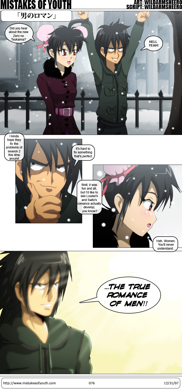 Squeezing in one last comic before the new year. I like this one quite a bit. It didn't call for much in the way of backgrounds, but I like how that first panel turned out. Sure, it's all blue, but that's because it's cold! Line art isn't exactly as I want it, but it never is. Overall I'm quite happy with this one. And yes, no matter what you say, 0nT2 is a true MAN'S ROMANCE. There's something of a break right now in terms of anime coming out, but I don't really mind at all since it gives me something of a chance to catch up with all the DVDs I got for Christmas. I decided to start off with the first volume of Air. I haven't seen the show in about 2 years, so it's pretty fresh to me. KyoAni's work rendered in DVD is lovely, but it's funny how rough the show looks compared to their current works. Not to say it doesn't look amazing, because it does, it's just cool to see how much they've improved in such a short time. The first epiosde was beautifully directed, and reminded me of how adorable Misuzu was. Let's see if the rest of the series is as good. I don't remember my impressions too well, but I think it's my favourite out of the KyoAni Key adaptations. Apparently the last episode of Minami-ke came with a preview for the next series, Minami-ke ~Okawari~ by studio asread (of Shuffle! fame.) I have to say that things look quite promising. I've heard that people in certain corners of the internet are already hating on it for some stupid reason. As far as I'm concerned, if the direction and scripting stay somewhat consistent, I don't mind. And before anyone brings up the fanservice aspect, think back on all the fanservice in Doumo's Minami-ke. There is quite a lot, even if you don't realize it. A lot of other series have ended, too. Once I catch the last episodes of Sky Girls and Minami-ke, I'll do a Year in Review post. That's it for 2007. See you all next year~ |