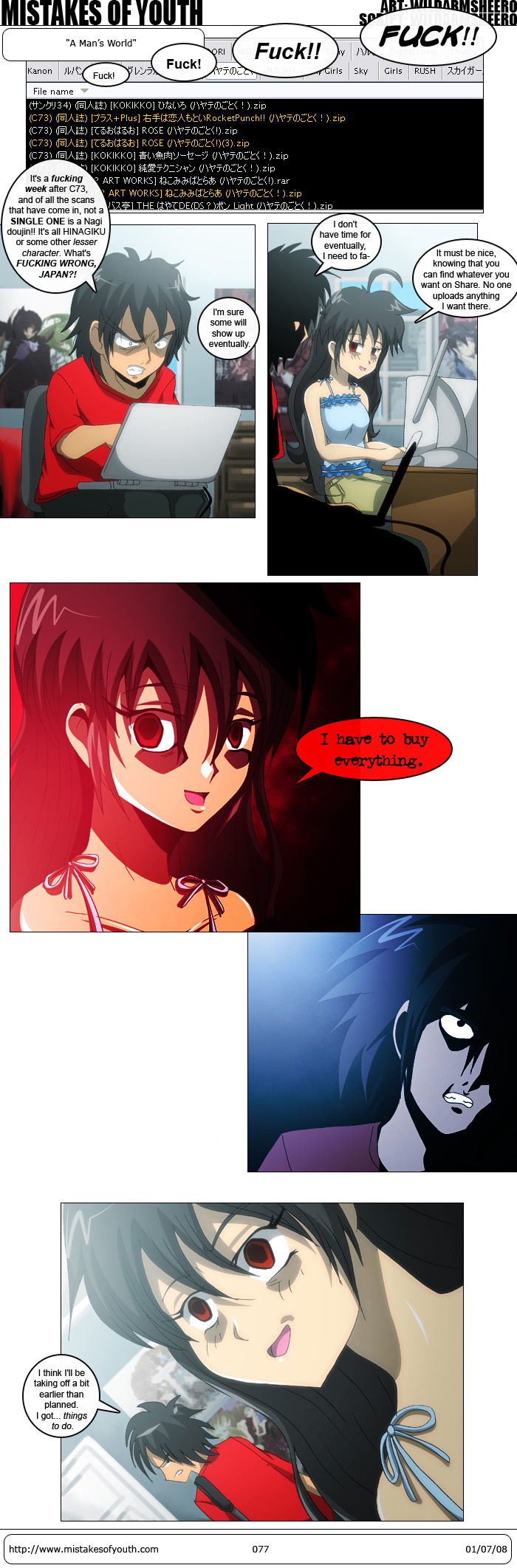 First comic of '08! It looks kind of bad! It's not totally horrible, but it's not totally good, either. I do like Tina's yandere face in panel 4, though. After reading this comic over and over, I realized that it's actually just this comic + this comic. Oops. This comic plays up the slowly developing insanity in Tina. Normally she's a cheerful fangirl with pretty well rounded opinions on things, but if you hung around Rets as much as she does, certainly you'd have instances where you'd crack. Rets, however, is smarter than he looks, and knows how the right time to exit. He should thank his lucky stars he's not dead on the floor. Yet. The severe lack of Nagi doujins out of C73 is a problem, though. I let last Comiket off since the show was just beginning, so naturally I assumed there wouldn't be a good turn out. But now the show is almost over, we are lacking in high quality Nagi porn! What is with the fixation on Hinagiku, huh? Tell me, Japan! Actually, I'm sure Japan would tell me to stop whining and just go over there to buy the things myself. Which I would like to do. Eventually. I may do a comic around that idea for next week, but it's not really fully planned out, yet. In any case, I am in despair. To console myself I'm downloading older Hayate doujins, hoping they will be of Nagi. It's fine, but I want stuff that's FRESH. FRESH, NEW AND WELL DRAWN. Sigh. Comiket, I will take you on. One of these days. New season has started, and as usual, I'm not watching the first episode of everything like every other blogger. I am a discerning individual, and can tell just from promotional art whether or not a show will be for me or not. My judgment has rarely done me wrong, so I'm fine with not watching everything. I have watched some things though, those two things being Zoku Sayonara Zetsubou Sensei and Rosario + Vampire. I won't say much here, since I'm reserving my thoughts for a blog post that may or may not happen. I will say that SZS 2 is more of the same except with better animation and the style may be a bit more off-beat and wacky. Rosario + Vampire is a stupid fanservice show, but provided Gonzo doesn't fuck up the animation, I could watch that for 13 episodes. As of right now currently looking forward to subs of Minami-ke ~okawari~, Gunslinger Girl 2, and the end of Sky Girls (I need to finish my year in review, dammit!) Before I take off, I'd like to mention a few things. The comic has gotten some press again, this time in the form of the Anime Genesis Podcast, and Aarin's Blog. Anime Gen declares me webcomic of the year, and Aarin gave me a fairly well thought out and honest review. Thanks to both of them. That's it for this week. I head back to school next week, but I'll try to push out another comic before then. Later! |