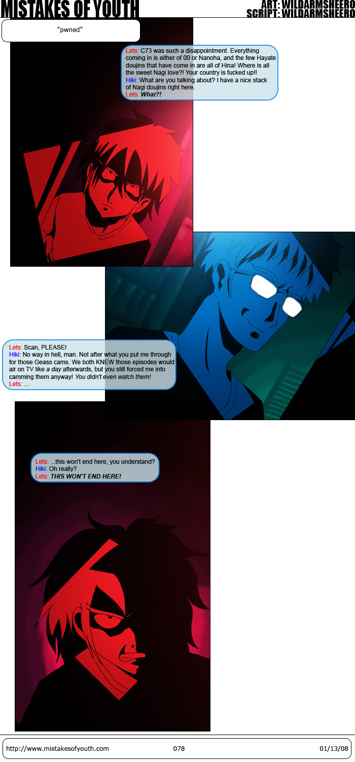 I watched Soultaker earlier in the week. I promise I won't do this ever again. Maybe. The script is about how downloading doujinshi is kind of bad. I know I have at least two Japanese readers, and one of them took offense to my comics about downloading doujinshi. If I could buy doujin easily, I would, but I can't. I download them because my penis is stronger than my morals, but I do buy as many as I can at cons and the like. Also, this comic references this other comic, if you forgot about it. In other site/comic news, we have some fanart. I'd also like to draw attention to my year in review, since I didn't write ~3,500 words just so no one could read them. Also this Eva review, which is just what everyone else wrote back in September, but whatever. That's all. I just got back to Boston, so I'm bit worn out from traveling. |