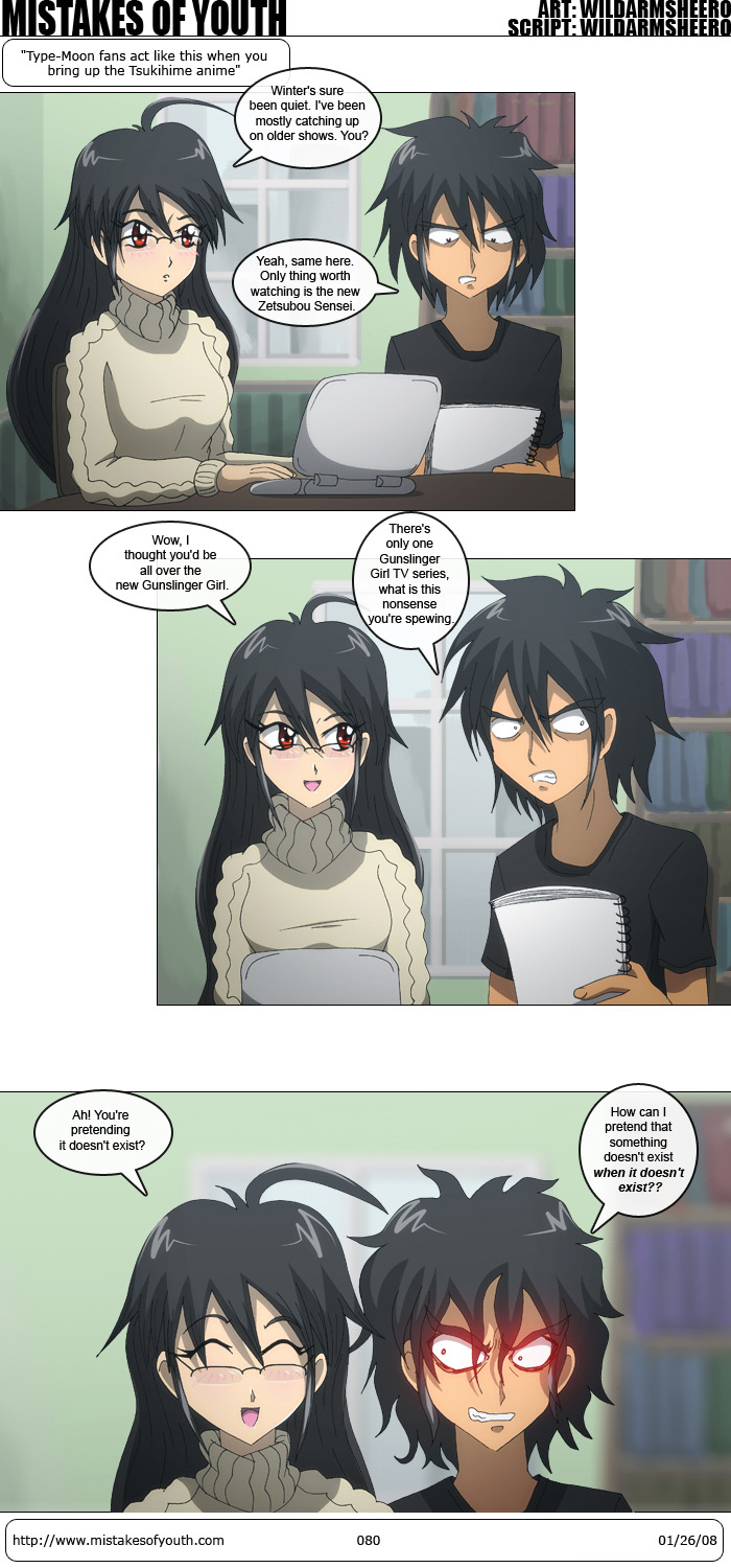 I like this script. It's solid. Gets the point across. Art is kind of bland, but let's just say it's a joke on Gunslinger Girl 2's poor quality animation. I was going to give GSG 2 the three episode test, but once episode 3 rolled around and I hadn't even watched episode 2, I gave up since I could only stand the show one episode at a time. I'm buying the manga now, so it's not as if I'm missing out on anything. In other site news, we have some new fanart and a new wallpaper. And yes, if anyone was wondering, I will eventually get around to updating the reference guide. Caught six episodes of Baccano! at MIT last night. I had planned to watch the show when it first aired, but didn't really get around to it. I was going to marathon it, but after it was over, all the wrong people where praising it, so I passed. I noticed MIT was showing it, so decided to go since if I can't be arsed to download it, I'll just walk 20 minutes watch it with something like 30 other people. It's quite a good show. As of right now, not as good as some people make it out to be, but it's good fun. The series is special because it has a lot things you don't normally find in anime, and instead pulls from older American films with a hint of anime craziness to spice it up. It works well. I like the ensemble cast-- each character gets a decent amount of time to show off how fun and wacky they are, so the show is never really boring in that respect. Naturally, my favourites are Isaac and Miria. The story is full of mysteries right now, but the show bogs you down with so much stuff that it's hard to really wonder about them. But that's fine, since half the fun is just watching it all play out, and hoping all the stupid commotion makes sense in the end. I should note that the opening is really awesome, and is now one of my favourites. It also gets bonus points for doing the Snatch thing. Also, MIT anime club, as much as I love you, I find issue with what is considered to be "Essential Anime." Actually, I only really object to two titles, those being Nodame and Gravitation. Replace those two with an episode of Zeta Gundam and Space Battleship Yamato. Hell, even episodes of Haruhi and Lucky Star would do-- they're far more "essential" than the likes of Nodame and Gravitation. That's all for right now. Time to use the free time I have now to get through some backlog. Later. |