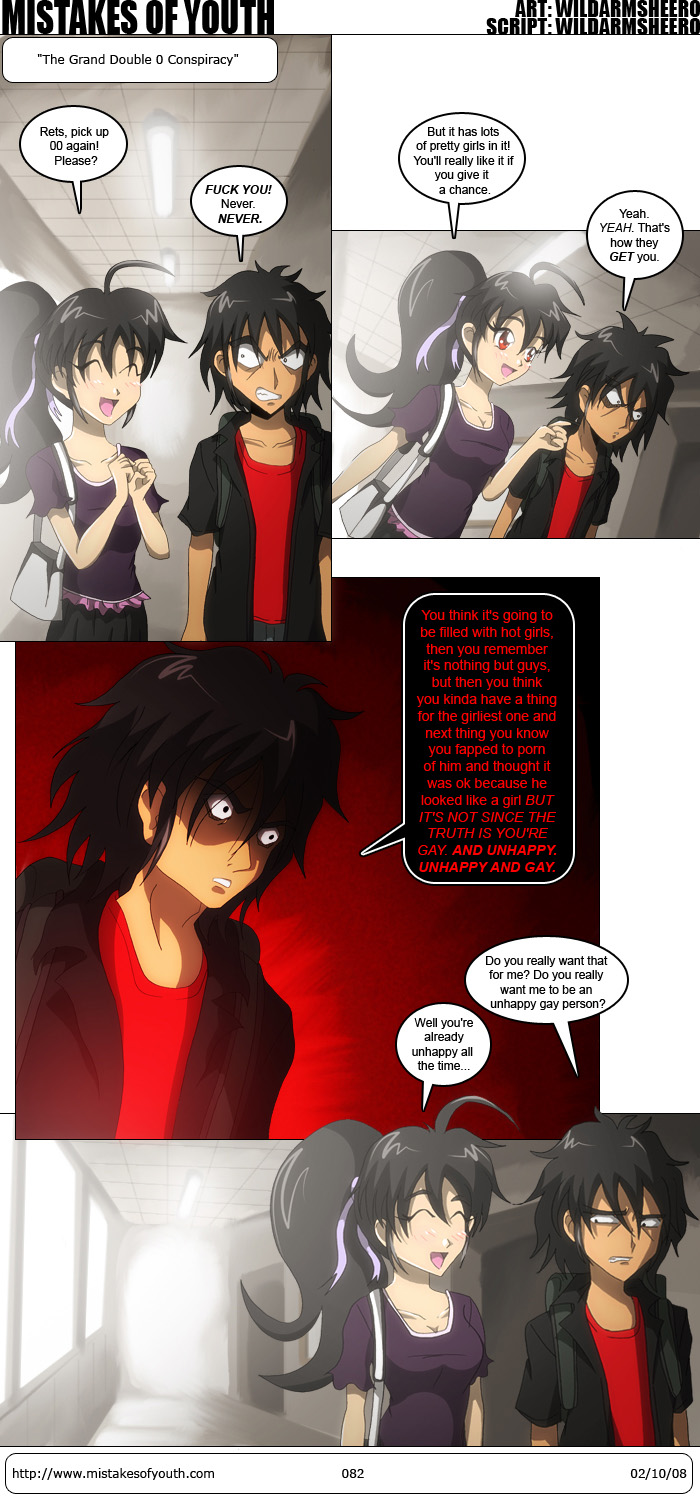 "no author is stupid enough to talk about their own comic on 4chan, except dan kim" And indeed, I am not that stupid. Hell, I don't even post on 4chan. Clearly someone is running around in my skin. Context would help, I suppose. Rewind to about a week or so ago-- I'm bored and decide to google my name, looking to see if people are saying dirty things about me (that's the one and only reason I blog and make a comic, after all.) I was happy to see that I had hit gold in the form of a 4chan thread. The thread, however, was gone. So, to narrow things down, I only searched for my name within 4chan, and then proceeded to add various other words after my name, trying to get other parts of the thread to appear in the google excerpt. Nothing of much interest showed up, but after that I searched for my name on 4chan daily. Throughout the week I came across more threads, all deleted, and repeated the same process to try and get the general gist of them. I came across remarks such as "stop posting wildarmsheero" and "gtfo wildarmsheero." Now, in my mind, "wildarmsheero" was shorthand for "wildarms' stupid horrible comic fuck that stuff" so I assumed they wanted whoever was posting my comics to stop. It wasn't until I came across the quote posted above did I conclude that someone was impersonating me. So yeah, guys, I don't post on 4chan. I'm a 2chan/danbooru guy. On the few times that I do post on 4chan, it's always as anonymous. Back in '03 when the site first hit, I did post under wildarmsheero and used a tripcode, but that seemed more common back then. I haven't done that for a good four or so years now, though. Anyway, one good thing came out all of this. In one of the google excerpts, someone mentioned that I had dated the last comic incorrectly. I have since amended the comic, and thanked 4chan accordingly. But, enough about that. Surprisingly enough, I like how this comic turned out. The background is pretty solid, and the character art is mostly ok. Rets looked pretty weird in some cuts, but I managed to hide the parts I didn't like with cropping and shading. Still, it's not perfect, I make my usual mistakes, but I like it. One thing I have to improve on is fabric folds and shading. Unlike anatomy, I can't quite see the method in the madness that is fabric folds, and to a lesser extent, shading. Guess I have to do more life drawing. Don't know if the script is funny, since I've read it 100 times and wrote it like months ago. Don't have much to talk about anime-wise. Winter season is slow, and I haven't yet picked up any older titles to plow through. Newest Zetsubou Sensei was amazing for a number of reasons, but I don't wanna spoil it. Other than that, I watched the first four episodes of Dennou Coil at MIT. I decided to give the show another shot since they were showing it. I still find it really boring, but it's better in large chunks rather than bite-size portions. Anyway, that's all for this week. Later. |