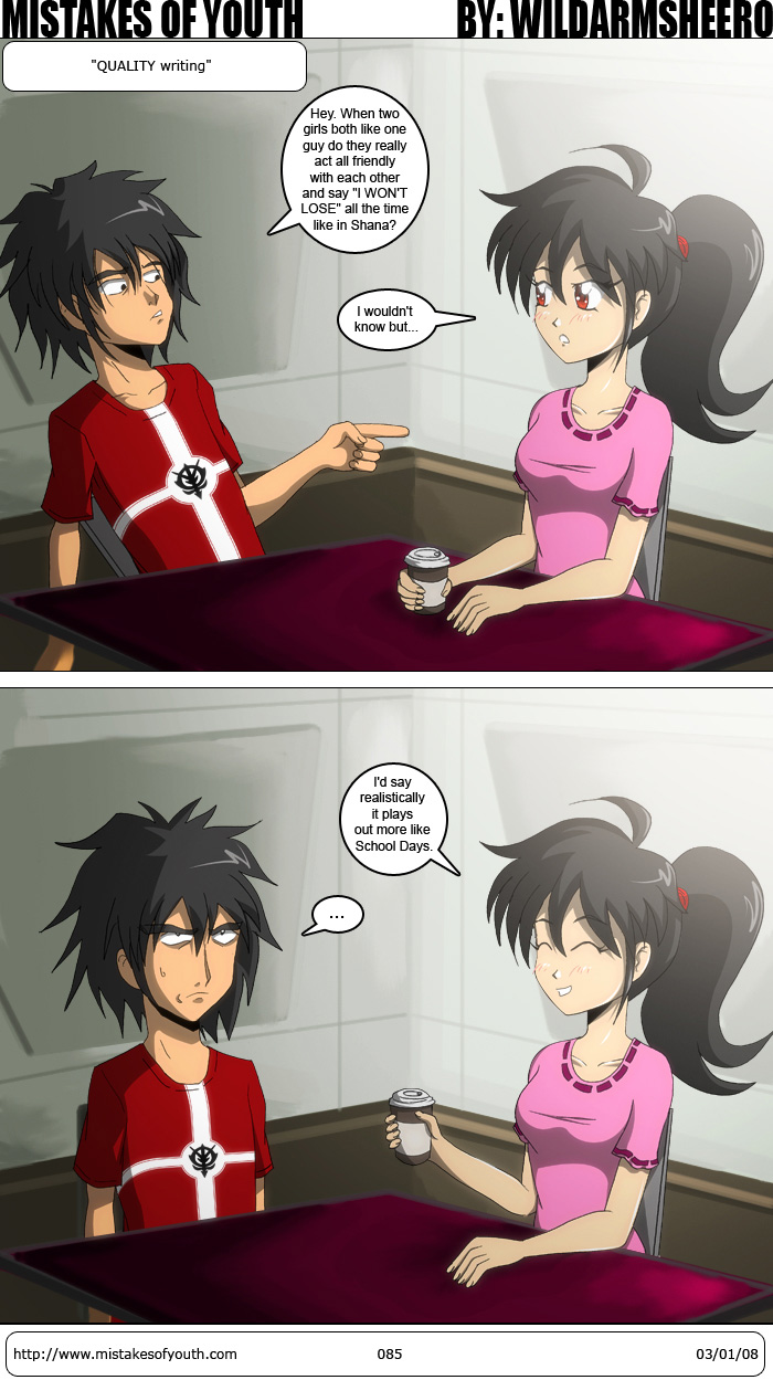 I actually had this one drawn and done for a bit. The idea was to get this one done real early, then have the one for next week done already. That didn't really pan out since I've been in something of a funk all week. No matter. This comic was real easy, and looks fairly good, I guess. I dunno why Rets has such a messed up expression that last panel, I guess I thought it would be funny. You know, the greatest thing about this comic is that you can probably put any kind of dialogue in and it could be funny. Probably funnier than what I have here. As you can see the comic is something of a joke on anime writing, highlighting two examples of QUALITY. Honesty, do girls really go "I WON'T LOSE!!!" all the time? Winter season is still fairly lame, and a lot of shows from Fall are concluding. Hayate seems to be going out with a bang, with a strong set of final episodes (manga-based?) and Clannad is ending well. I kind of wished I'd just stayed with the widescreen releases of Clannad instead of watching both 4:3 and 16:9 versions. I kept up with the 4:3 mostly because I didn't want to miss any discussion on it, but about 19 episodes in, there's not much to talk abut. Yes, I do appreciate that Clannad was trying to be different in not telling overdone sob-stories, but as a result it comes off as rather boring. Well, boring isn't the right word. Maybe not as memorable and engaging. I guess it's not good that I don't really dig the characters all too much (well, it's more I don't like Kyou and to a lesser degree Tomoyo.) Nagisa, however, is cute as a button, so I guess that's fine. This last arc is shaping up to be a good one, but I doubt Clannad will leave much of an impression in my mind. I've been catching episodes of Diebuster at MIT lately. Diebuster gets a lot of flack for various reasons, but I like it well enough. I think it lacks the punch of its predecessor, but is in turn a more competently structured story. The first two episodes are rather weak, I'll admit, but the show settles into its groove at around the midpoint, and then does nothing but impress from there (splitting of planets etc). Maybe one of the problems people see with Diebuster is the lack of too much overdone drama. Sure, there's drama, but Gunbuster was pouring that stuff on at episode 2. Personally, I like Diebuster's approach better. Makes the show easier the watch. Another thing I've caught snippets of at MIT was Ergo Proxy. For those who don't know, back when Ergo Proxy hit I was kind of looking forward to it as a fan of Witch Hunter Robin. I dropped the show after nine episodes. I caught the first four episodes again a few weeks ago, and episode 8 last night (was trying to get there in time for Diebuster, but ended up watching an entire episode of EP, too.) The show is beautiful. I love dark, grey colour schemes. Always have. The show puts together a nice, if not somewhat generic, futuristic dystopian world. I think it looks great. The praise stops there though. The actual content is kind of meh, and the only good character is Pino. No, not because I'm a lolicon, because she's genuinely entertaining. That's all I got for today. Let's hope I can get something out by next week. I sure do have plenty of scripts to work off of... |