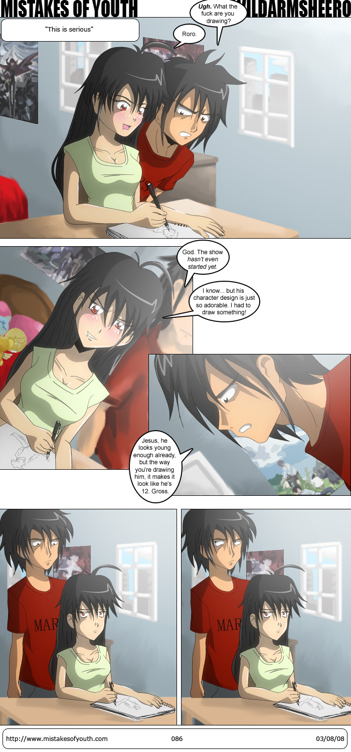 I don't know how to feel about this one. The biggest problem was that I forgot to draw Rets in panel 2, so I had to hastily sketch him in Photoshop. Though, looking at it now, I kind of like that. Tina's face also looks too long in some planels. Bleh. I guess I like it more than others. And yes, I know that messy little scribble on the sketch pad doesn't really look like Roro-- I didn't wanna put to much time into drawing man porn. The joke seems solid enough to me. Anime Boston is in something like two weeks. I'll be there, but I won't have a table or anything. I'll just be walking around with some dudes. Most likely my server admin and Seiya (gotta get back in contact with him!) and will probably meet up with DS and Hinano. About half-way through Dennou Coil, and it's finally starting to show its stuff. The fish episode and the beard episode do a good job of playing with the setting they've created far better than the opening episodes. Also, a lot of interesting plot developments are starting to take shape. I actually want to see the next episode, now! Finished Diebuster again. I almost forgot how incredibly epic the ending was. I almost want to buy those Bandai Visual DVDs, now. Almost. Anyway, cutting it short today for whatever reason. Got some raws/subs to dig into and a Shuffle! DVD. Later. |