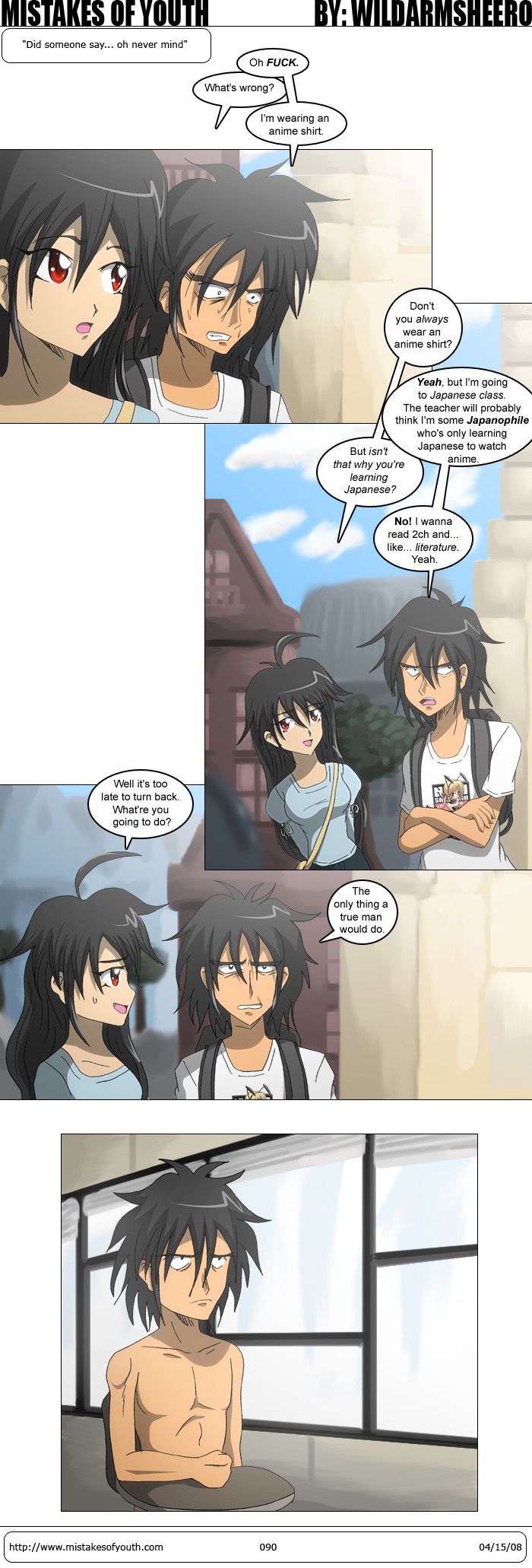 Little late with this one, but I was kind of in a funk for the last couple of weeks. That coupled with a whole shit ton of anime and homework hitting me like a ton of bricks hindered comic production. But here we are, at Tuesday, with a new comic. I hate liking what I do, but I'm kind of happy with this one. Yes, the art is wonky as usual (make your threads now, 4chan!!) but I generally like how it turned out. The script is something I came up with right around when I started Japanese class last semester, but only got around to making it now. With school about to end for the year, the timing is a bit off, but whatever. For the record, I am myself am shameless with wearing anime shirts to class. I just really don't care. God, spring season. Anyone who's been reading the blog will know that I've been documenting my first impressions three at time across various posts. I'm actually working on part IV of that, I just need time to sit down and write it. Overall though, I'm quite satisfied. Some stinkers and wholly mediocre entries, but enough quality to go around. My two favourites off the top of my head have to be Kure-nai and Macross F. Code Geass and Kanokon get mentions for best trash of the season, in two very different ways. Kure-nai is a bit lighter than I expected it to be, but that dark undercurrent is still there. It could go on being a lighthearted Odd Couple affair, but I want it to act on its darker side a bit more. Macross F is just fucking impressive anime SF. I haven't seen anything this good in a while. It has 3D work that's actually good! Code Geass is something I rag on, but watching this second season has made me change my tune. I guess it's just the fans that are pretentious, because season 2 reminded me that Geass knows it's silly shit and loves it. Episode 2 was one of the most hilarious episodes of anime I've ever seen. Sunrise isn't really taking this shit seriously at all, and neither should you. I may write a blog post on how Geass is such a great entertainer, but I need to find time. Kanokon is just well animated softcore porn, and I respect that. I like fanservice shows, but they have to be well done. Kanokon has sexy production values, so I'm sticking around for that. Anyways, I'm playing catchup in the game of life at the moment. I need to catch up on homework, catch up on anime and catch up on making comics. As such, I'll be taking my leave. |