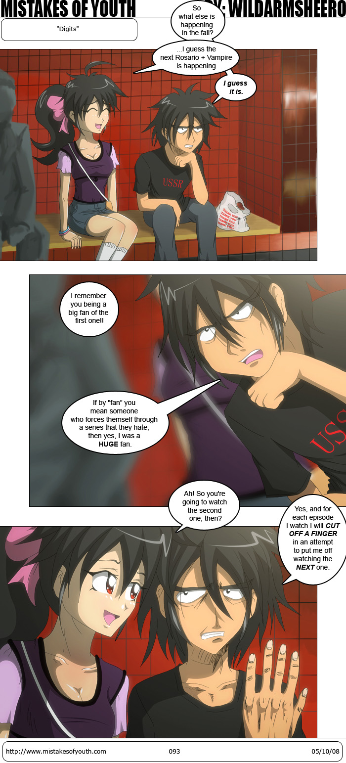 Looking back through the archives, I noticed that I hadn't even so much as touched upon the issue that is Rosario + Vampire. To atone for this grievous sin, here is a comic which more or less sums up my feelings on the upcoming sequel. I have nothing against fanservice shows, but R+V is a pretty good example of how not to do one. It does get points for Shuuichi Ikeda, though. As far as this comic goes, I'm pretty happy with how the script turned out, and I will admit I was partially influenced by Kaiji when I wrote the punchline. The art is fine-- I'm happy with panels 1 and 2, but panel 3 is all too rushed. It looked great in messy sketch form, but not so much when I cleaned it up. The Ascii Weekly article from a few weeks ago gave the site some pretty decent exposure. I got about 600 more page views that usual and a blog entry! Who knows, maybe I'll even get a translation deal! (no) Lots of big news came in over the week, and it being big makes it worth mentioning here. I talked about the new Haruhi 2 details earlier in the week, but since then there have been further developments. I'm glad to see things are moving along, as I was beginning to think that small bit of activity almost an entire year ago would amount to nothing, but it seems things are progressing in some way. It's my theory that Haruhi 2 progress was being held up by this, but perhaps that's all sorted out now? I hope so, since I really want to see Haruhi 2 before Clannad 2. Three years between seasons is pretty lame. The other piece of big news is the arrests of three major Share users. All of the guys they caught were pretty big raw cappers, one of them being my personal favourite, YS2. It's not like this will affect fansubbing much, since as I learned upon my rediscovery of Perfect Dark there are raws a plenty. It's just sad to see these major providers be taken down by The Law. I'm not RAW RAW FREE ANIME or anything, but I appreciated what these guys were doing in bringing not-yet-licensed anime to the world. Library Wars subs kind of hit like a ton of bricks last week. Better late than never, I suppose. Now that it looks like the show is being decently subbed, I've taken up watching it. It really is a treat, since it's the first Production IG show in a while that hasn't totally sucked. Yeah, it's not perfect, but it has all the qualities that remind me of why I list Production IG as one of my favourite studios. It kind of feels like GITS except way lighter, which is only a good thing since I can only handle GITS when I'm in a total srsbzn mood. The concept is ridiculous, and certain portions of the show are less than well done, but over all it's a decent package and at 12 episodes long it won't overstay its welcome. Kyouran Kazoku Nikki is a most bizarre show, mostly in that it's not nearly as bizarre as its concept and opening sequence let on. The drama in episodes 1-3 has been very surprising, and personally, it only worked for me in episode 2. Now that the cast is fully assembled, I hope it'll focus more on comedy, with this drama portion just being an awkward opening to an otherwise hilarious show. It's still a touch above a lot of other things airing, but the drama just feels off considering how the show presents itself. That's it for this week. I'm heading back to DC next week, so there may or may not be something of a delay with the next comic. |