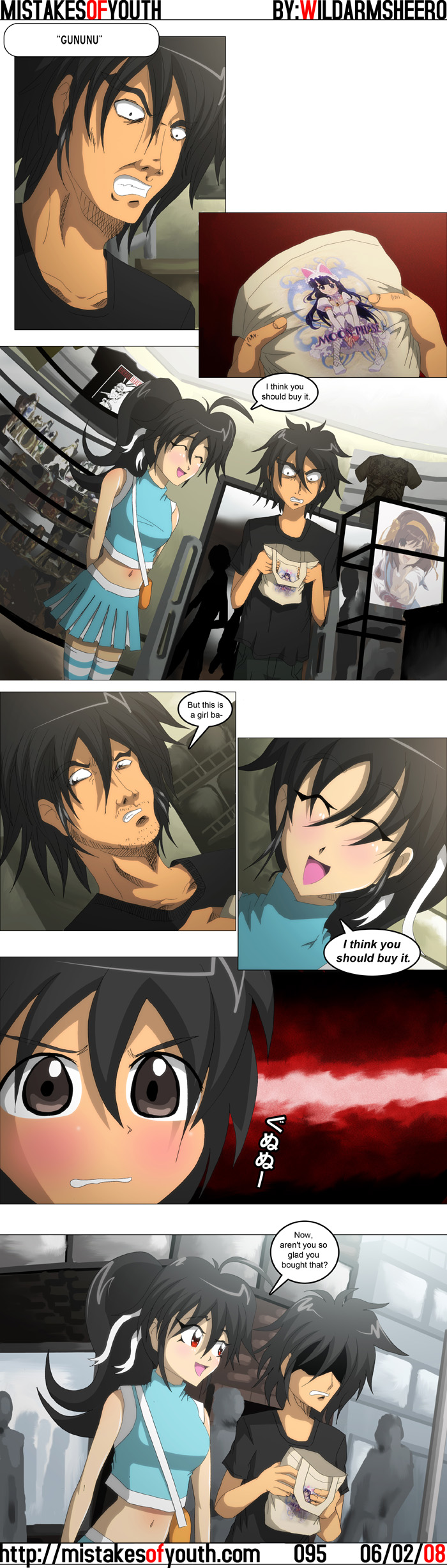 This comic is pretty horrible in every way, but at least I got to draw the gununu face! Aside from that though, the rest sucks. Especially that last panel. I actually had to edit that so it'd look less like ass, if you can imagine that. I do like how the background in that one turned out, though. Still messing around with a new template for the comic-- I just switched comic construction to 300 dpi (I always do character art in 300 dpi, but constructing the comic was done in 72 dpi before now), so I figured I may as well change the layout a bit too. It's a work in progress. This comic took ages for some reason. Maybe because it's 7 panels. Next comic will be 2 panels because I'm lazy. Answerman linked me for some reason, and it's been brining in decent traffic. Not as good a StumbleUpon link, but decent. Not sure how I feel about ANN readers here, since I think I go against everything that site stands for, but so long as people stay I'm cool. If you've been following the blog you would know that I just got my new computer (and no, it's not the one pictured here. That's the old one.) It's great. Photoshop never slows down and I can watch highres subs! There are however bugs that need to be worked out. Two somewhat big ones, to be exact. Anyway, I need to cut things short since I have a large backlog of anime to get through. Until next week...! |