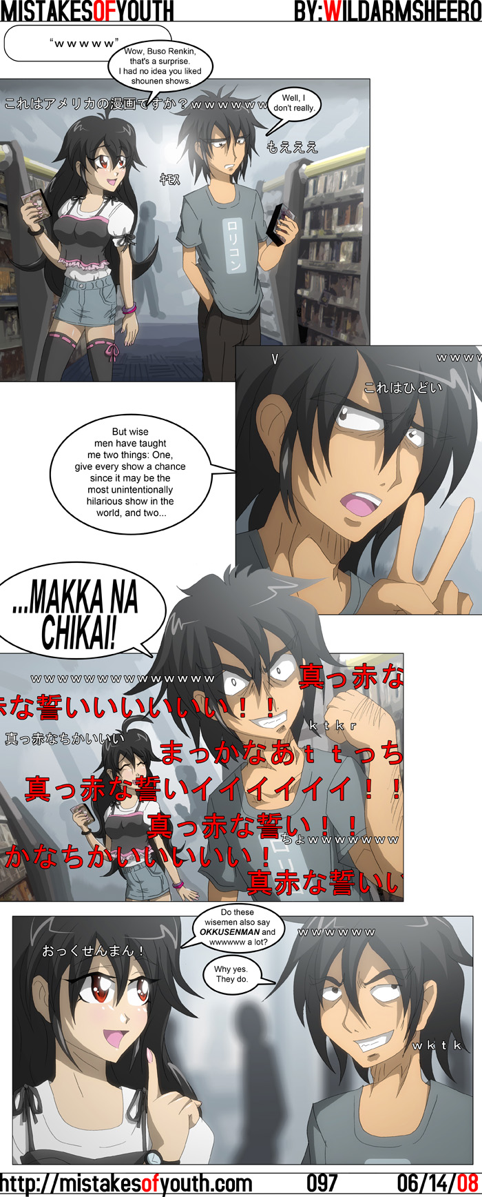 I really like how this comic came together. Everything from the lineart, to the colouring, to the backgrounds looks almost exactly as planned. I'm sure there are rough patches here and there, but I really like this one. I've actually kind of been practicing at drawing things I'm not too good at (like girls lol) and I think the fruits of that practice shows here. The lineart for the comic after this one looks pretty good, too. As far as scripting goes, I guess the humour here lies more in the comments than it does in the script. If you haven't already guessed, this comic is a Nico Nico Douga parody, and like Nico offers, here's a version of the comic with comments "turned off" for those who want it. But the comic's only funny with self-depreciating comments like "kore wa hidoi" anyway! Another week, another Anime Blog Award awarded, it seems. This time it's the blogger's choice Gold Award for best blog comic. So yeah, thanks to you guys who voted in that. Lately I've started using pixiv, the Japanese and infinitely less-gay version of DeviantArt. I've been looking at cool art there and posting some of my own, and surprisingly I'm being well received. Two different users have already favourited both of the pictures that I've uploaded, and I've also managed to get one comment already. And before anyone asks-- yes, I'm writing everything in Japanese. Instead of forcing English upon these people, I figured it'd be better to force broken Japanese on them! Everyone's heard about this by now, but I figured I'd talk more about the AKB Massacre here. Internet reaction has ranged from truly shocked and saddened to "do you know how hard it is to kill people with a knife?" Naturally, I'm saddened, since murder is a horrible thing and the fact that fellow otaku probably went down makes it worse. I just hope things settle down by the time I make it over there. I finished Nadesico the other day, watched the movie, and came out relatively satisfied. The series was slightly lighter than I expected it to be, but that's fine. The show was mostly composed of one-shots with some story episodes thrown in. The one-shots (I hate calling them "filler" when 75% of the show is composed of these episodes) ranged from moderately entertaining to very good, with some of my favourites coming at the end. The movie was great, and really recaptured the fun of the series while telling a decent, compact story. It could have used an extra 20 minutes to breathe, but as far as anime movies based on TV shows go, it was killer. I especially really liked the clean, sexy animation and updated designs. There's this one great shot where Ruri gets out of the bath, and you can see all down her body. It's amazing. If you've been following the blog, you'd know that recently I've been getting a lot of manga (mostly due to Borders and B&N gift cards) to make up for all the manga I've not been reading. Thus far I've only barely scratched the surface, and am only part-way through the first Keroro Gunsou collection. I've also downloaded a bunch of things, of which I've also barely made a dent into. I read one chapter of Maken Ki, a new-ish fanservice piece which gets by entirely on detailed pantyshots and boob shots. I guess the script would be as readable as ToLoveRu if the translators didn't have both English and Japanese as second languages. Aside from that, I've also read all of what's been translated of Negative Happy Chainsaw Edge, and it's pretty great. You'd think it'd exploit its silly concept more, but the story puts its focus primarily around the developing relationship between the main hero and the girl who fights the chainsaw man. It's not crazy original, but I like it. The art is cool and angular, and at times looks a little awkward, but to good effect. I recommend it. That's all for this week. I start work in a couple of days, so updates may get effected by that.They probaby won't, but there's a headsup just in case. Later. |